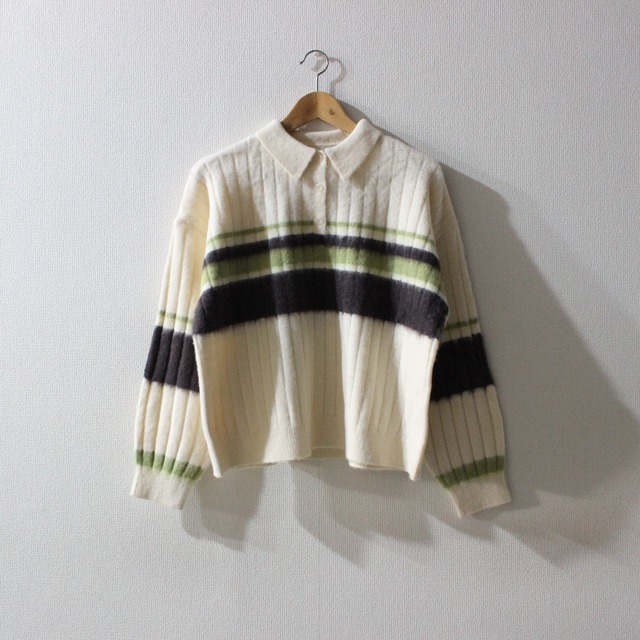 サイズ F(M-L) 着丈59.5㎝(最長部) バスト約115㎝ 袖長さ約53㎝ 腕回り約44㎝ 伸縮性はあります。 透け感はほとんどありません。 ひっかけにご注意ください。 平らなところで平置きにして図っています。 状態により、数値に若干の誤差がございます。 実際に近い色合いに撮影していますが 若干の違いが生まれることがございます。 カラー アイボリー ブラウン 素材 アクリル42% ポリエステル32% ナイロン26% 原産国 中国 アルパカタッチのボーダーポロニットトップスです。 ふんわりとしたアルパカタッチの糸で編み立てられた シーズンムード漂うボーダーポロニット。 起毛感のある質感が柔らかな表情を生み 淡い配色のボーダーが大人の抜け感を演出します。 リブ編みの縦ラインがすっきりとした印象を与え ゆるめのシルエットでリラックス感のある着心地です。 襟付きのデザインがカジュアルになりすぎず デニムからスラックスまで幅広くマッチします。 1枚でもレイヤードでも映える、冬のワードローブに取り入れたい一着です。 モデル身長約154㎝