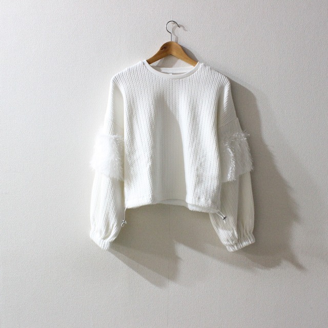 サイズ 1(S~M) 着丈約49㎝(最長部) バスト約104㎝ 袖長さ約44㎝ 腕回り約44㎝ 裾が絞れるようになっています。 伸縮性は少しあります。 透け感はほとんどありません。 ひっかけにご注意ください。 平らなところで平置きにして図っています。 状態により、数値に若干の誤差がございます。 実際に近い色合いに撮影していますが 若干の違いが生まれることがございます。 カラー オフホワイト モスグリーン ブラック 素材 本体 レーヨン49% ポリエステル29% ナイロン20% ポリウレタン2% リブ部分 綿95% ポリウレタン5% 後身頃 ポリエステル100% 袖フリル部分 ポリエステル100% 原産国 中国 ふっくらとしたバルーンスリーブに フリルが特徴的なフリルスリーブプルオーバー。 本体生地にはヘリンボーン、背面にはボアを使用し 温かみのある素材感で秋冬大活躍間違いなしのアイテムです。 ショート丈なので、ワイドパンツやボリュームのあるスカートとも相性抜群! ボトムスとのワンツーコーデでサマになります。 モデル身長約154㎝