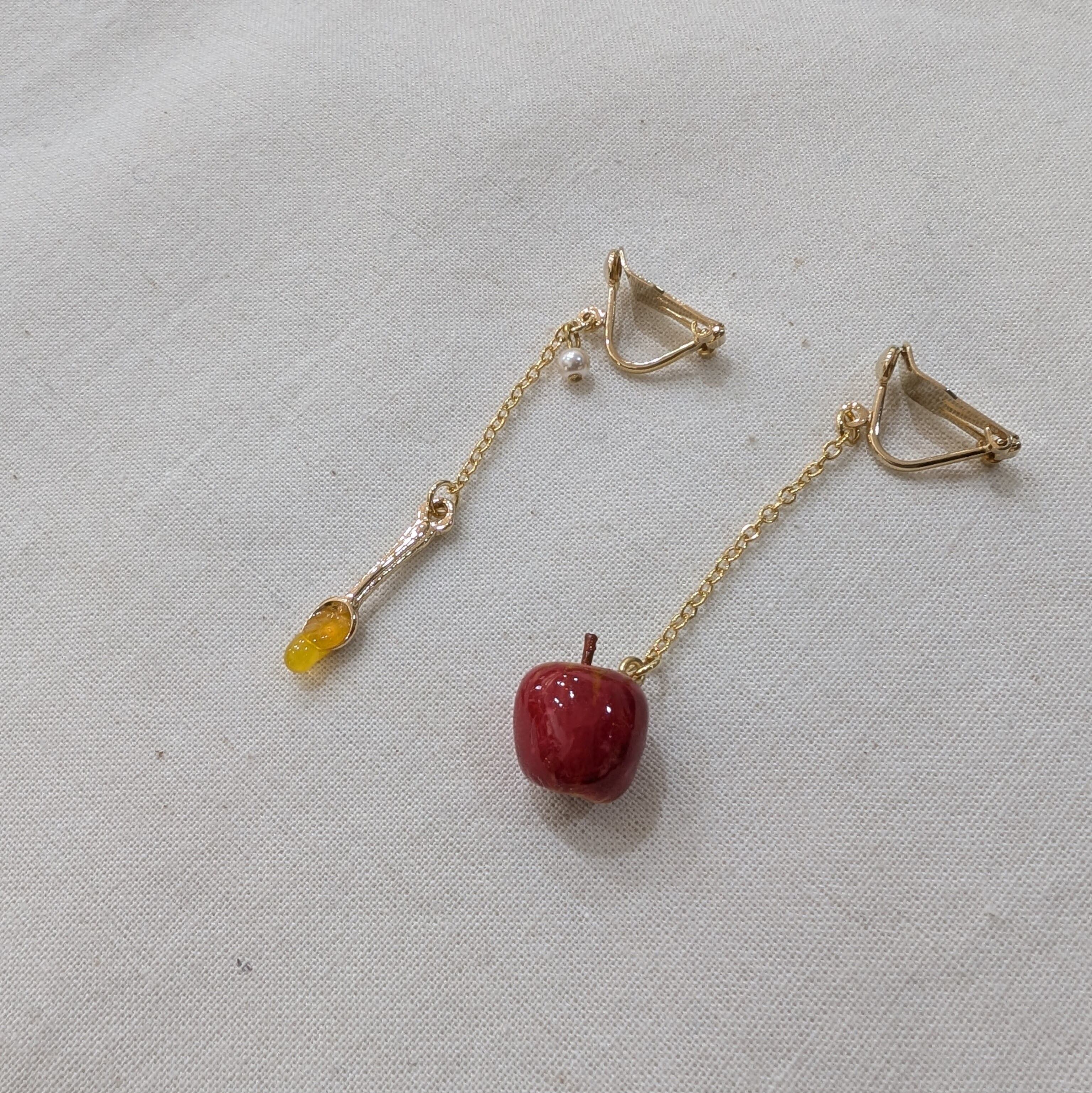かじられたリンゴと蜂蜜スプーンのイヤリングです。