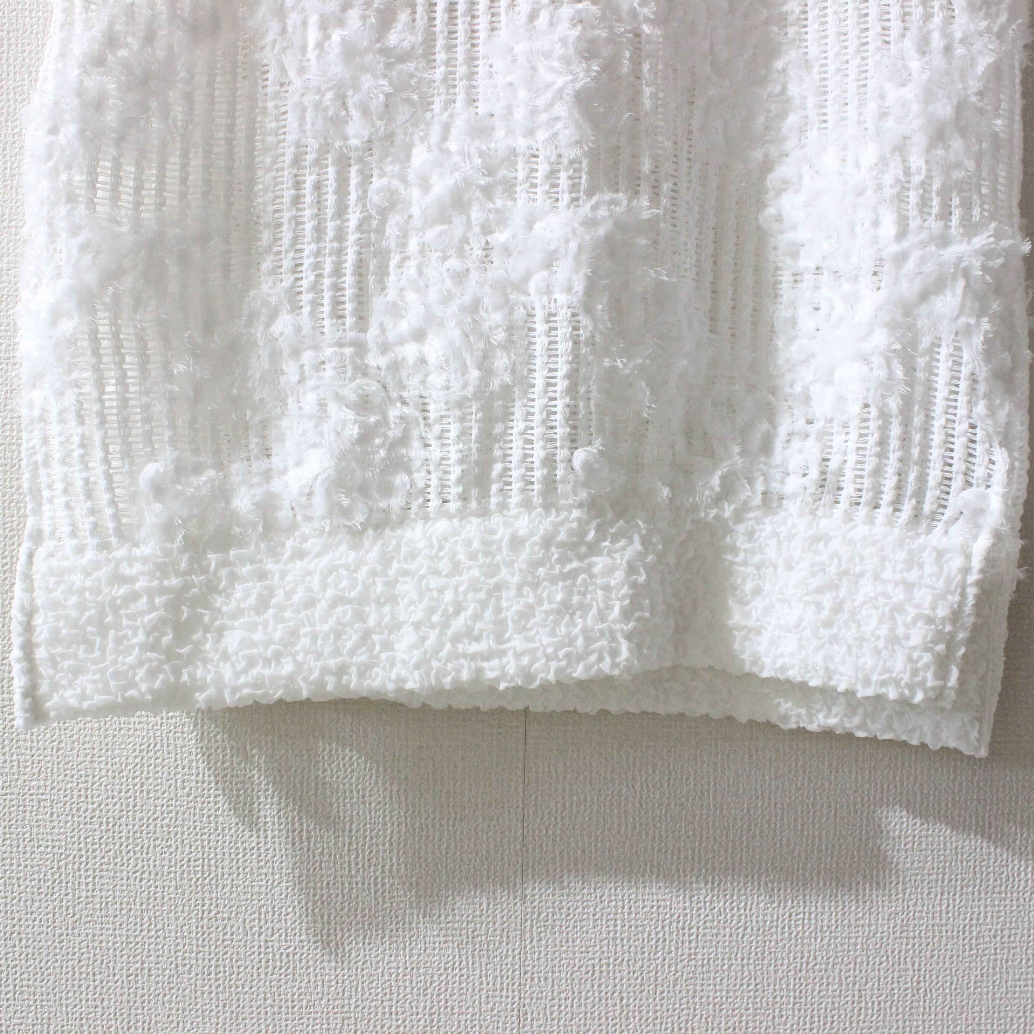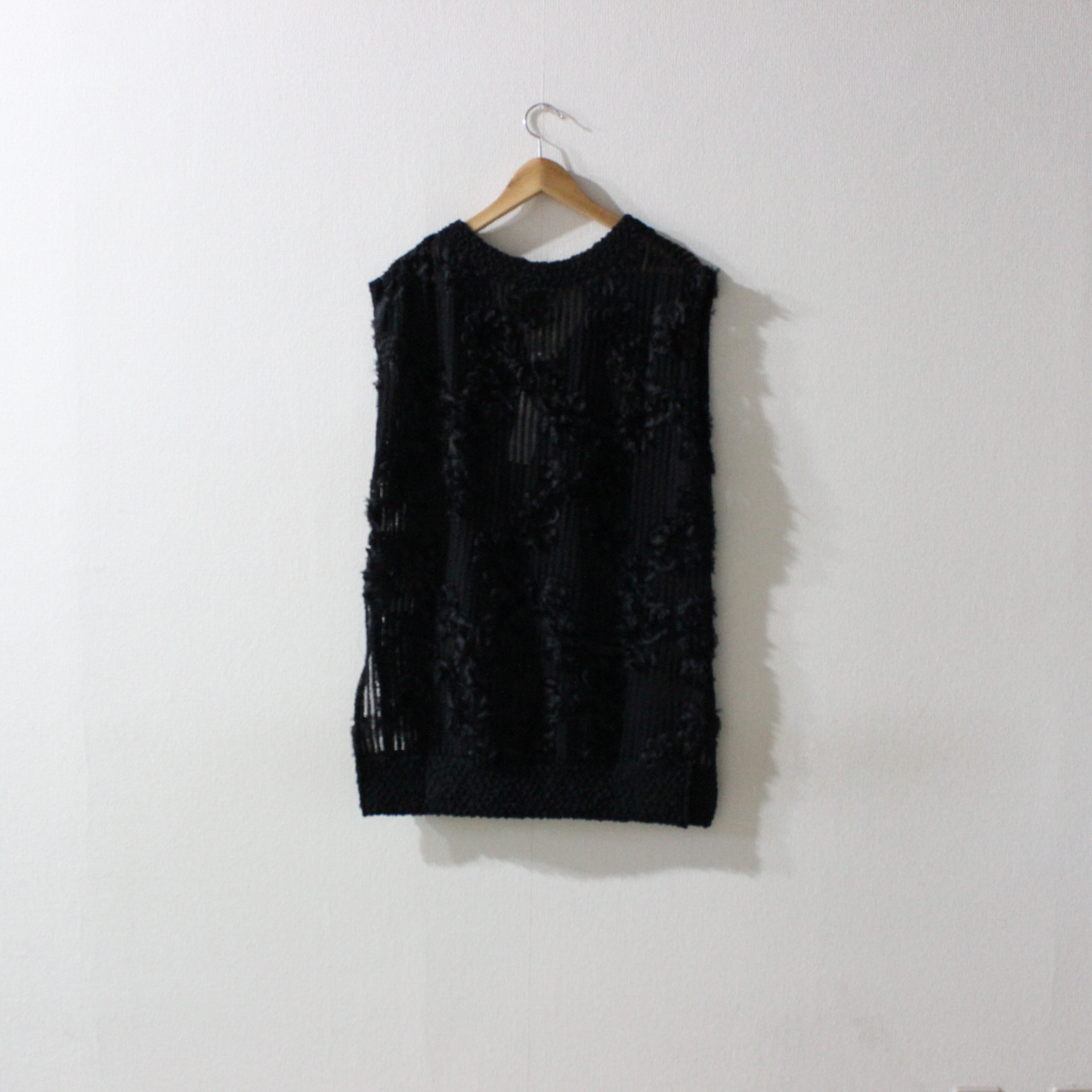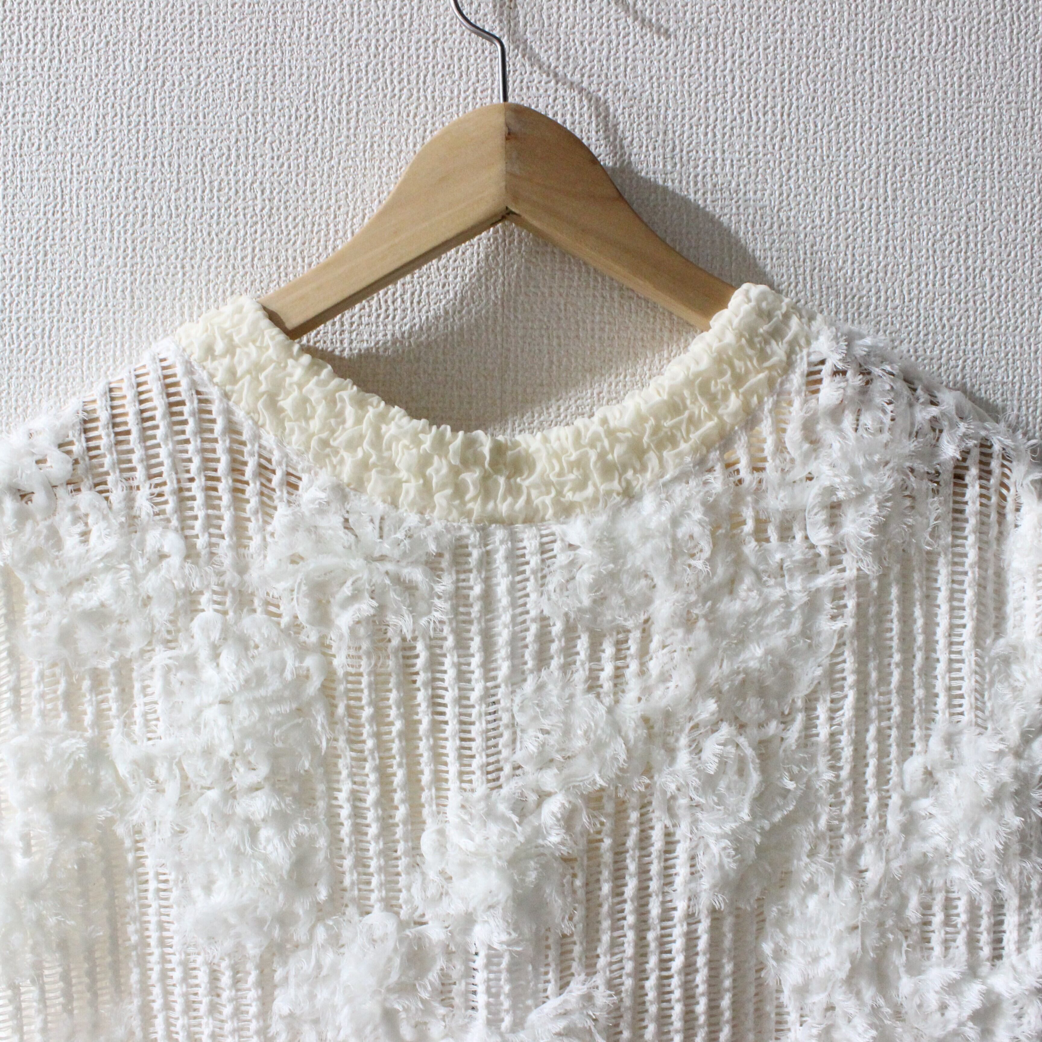 透かし編みニットの上に立体的な花模様のフリンジ刺繍をあしらった