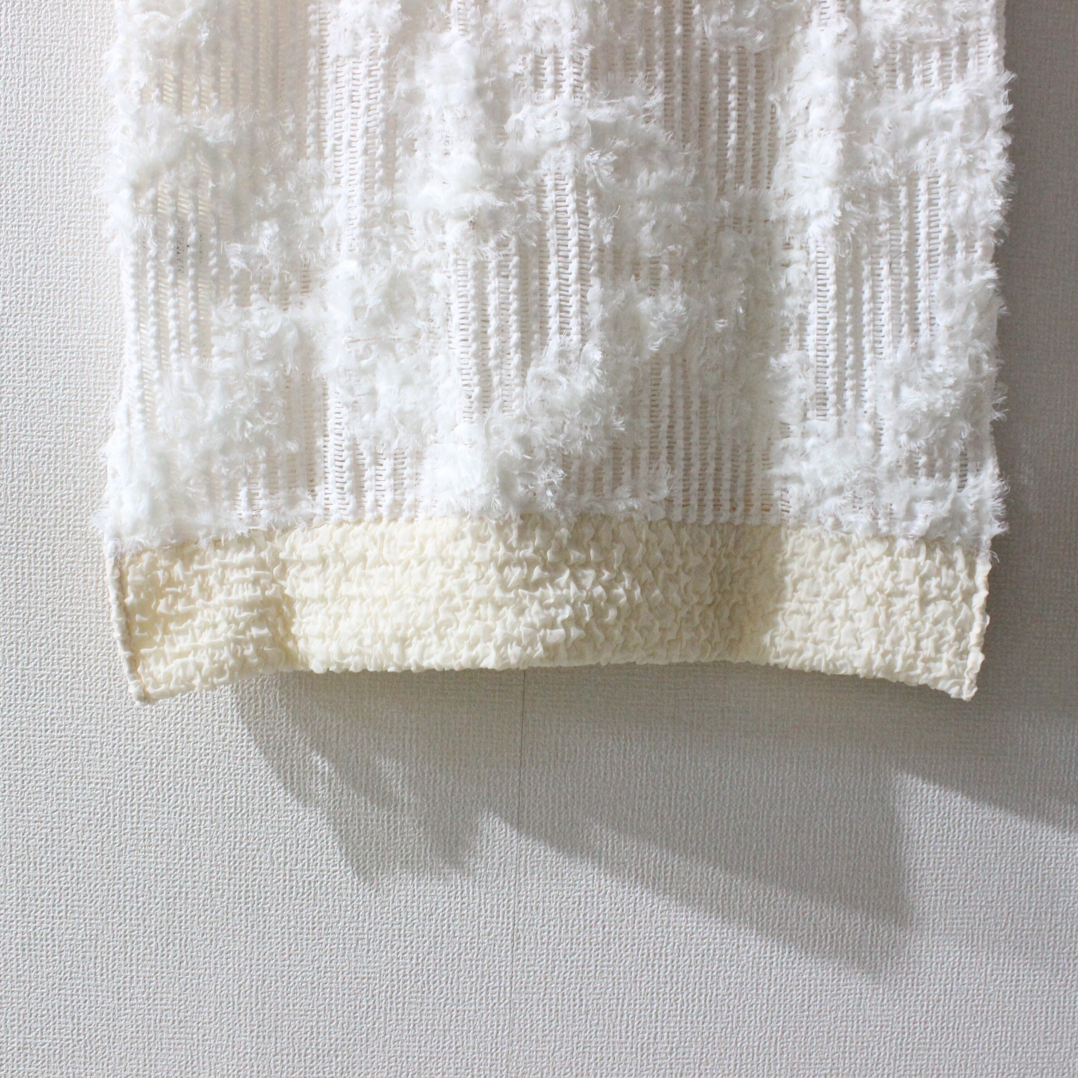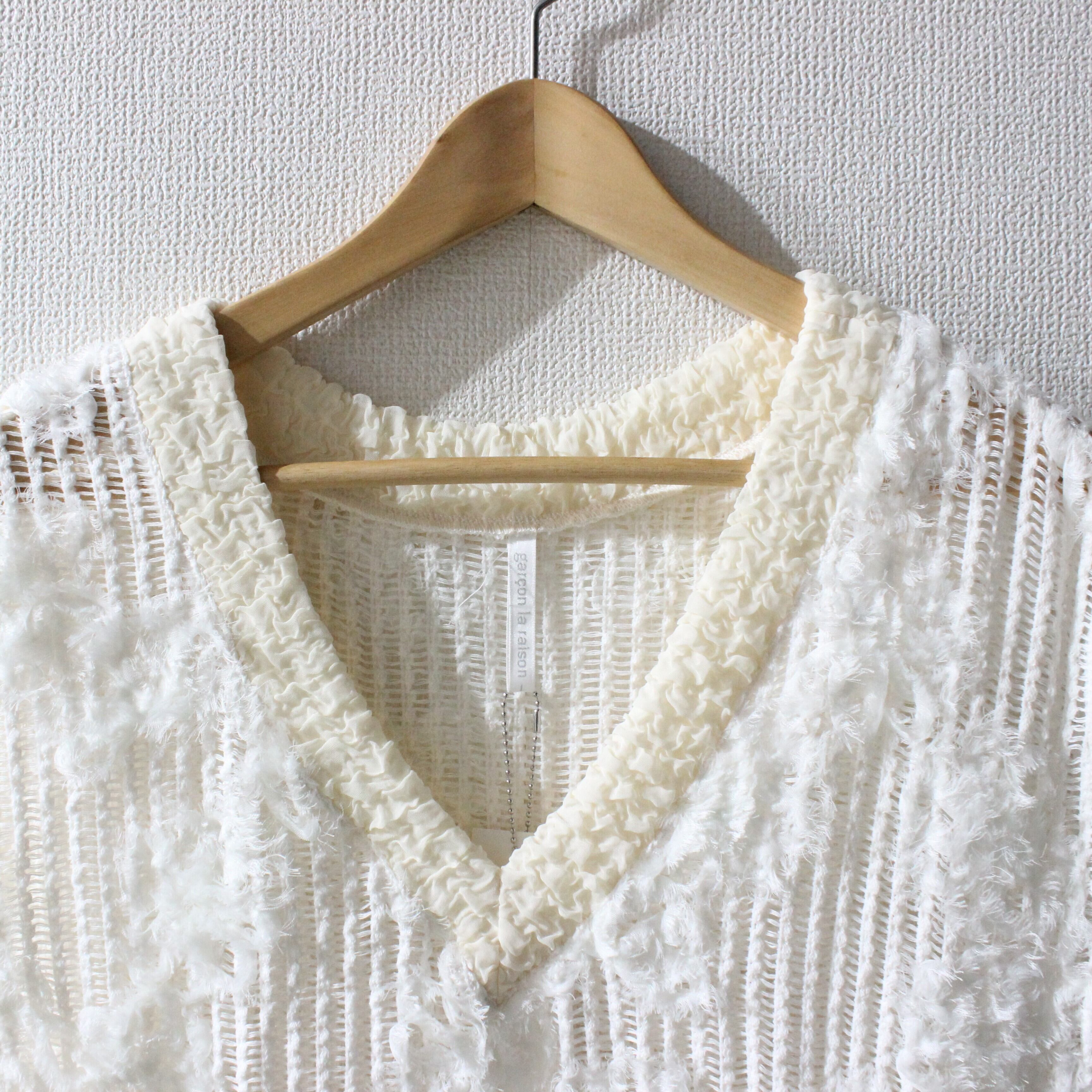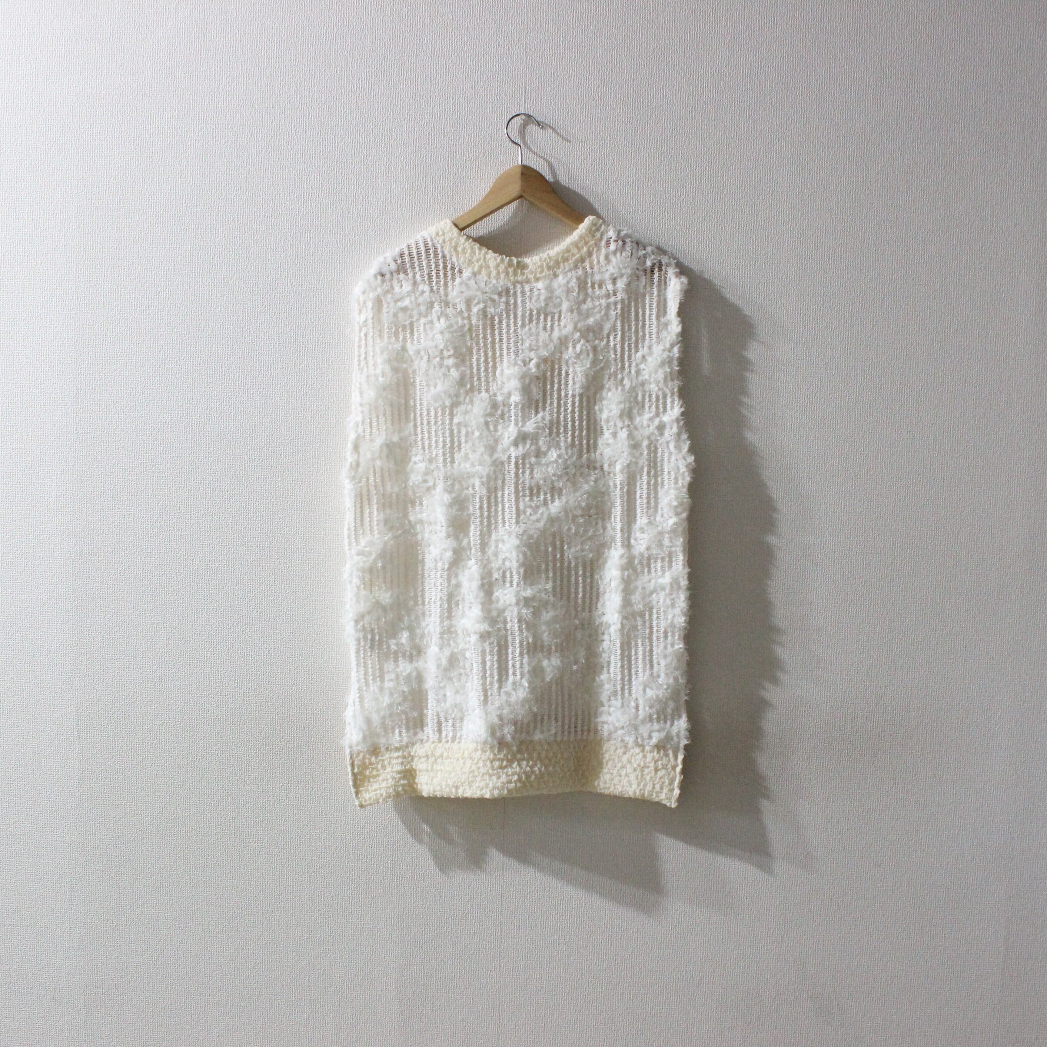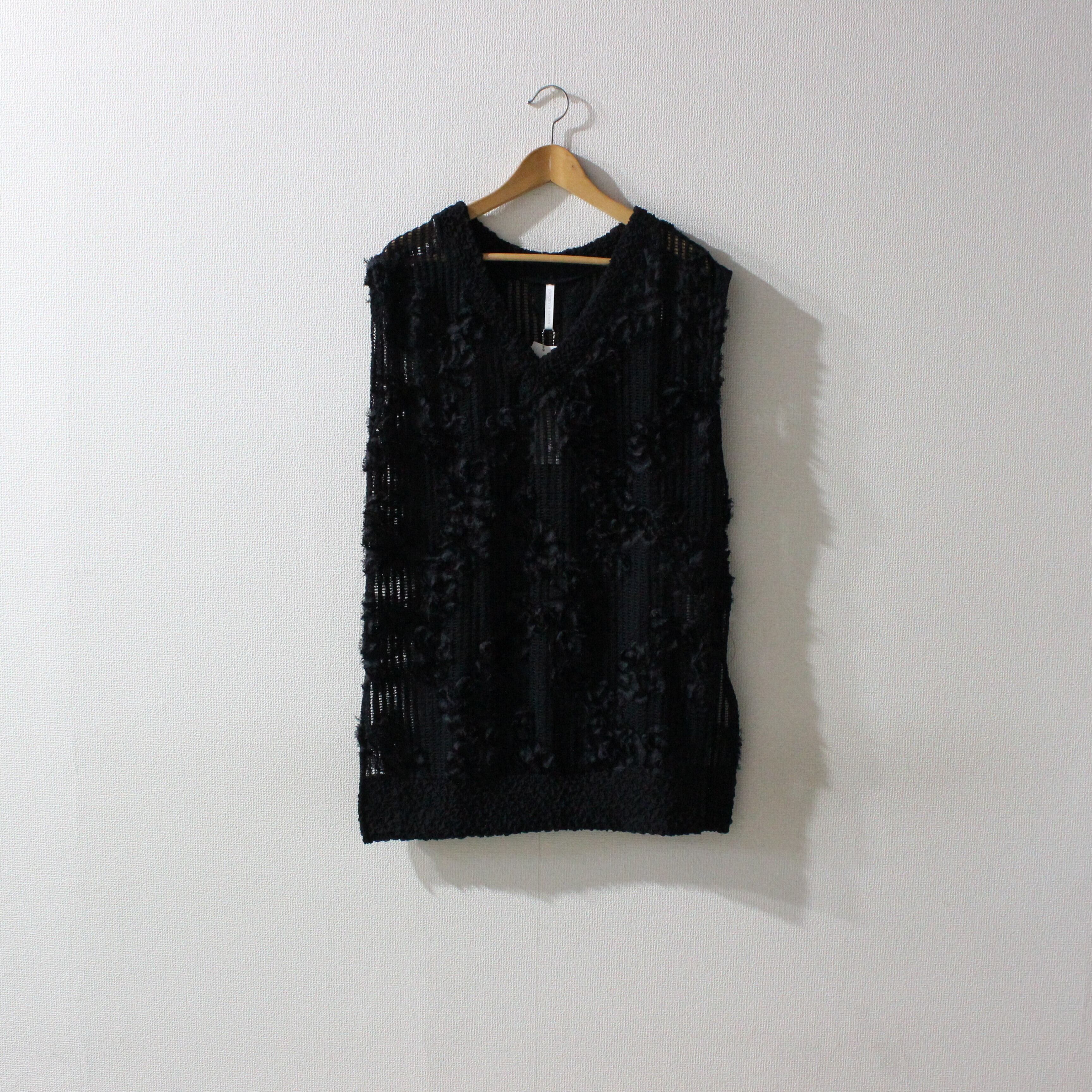 透かし編みニットの上に立体的な花模様のフリンジ刺繍をあしらった