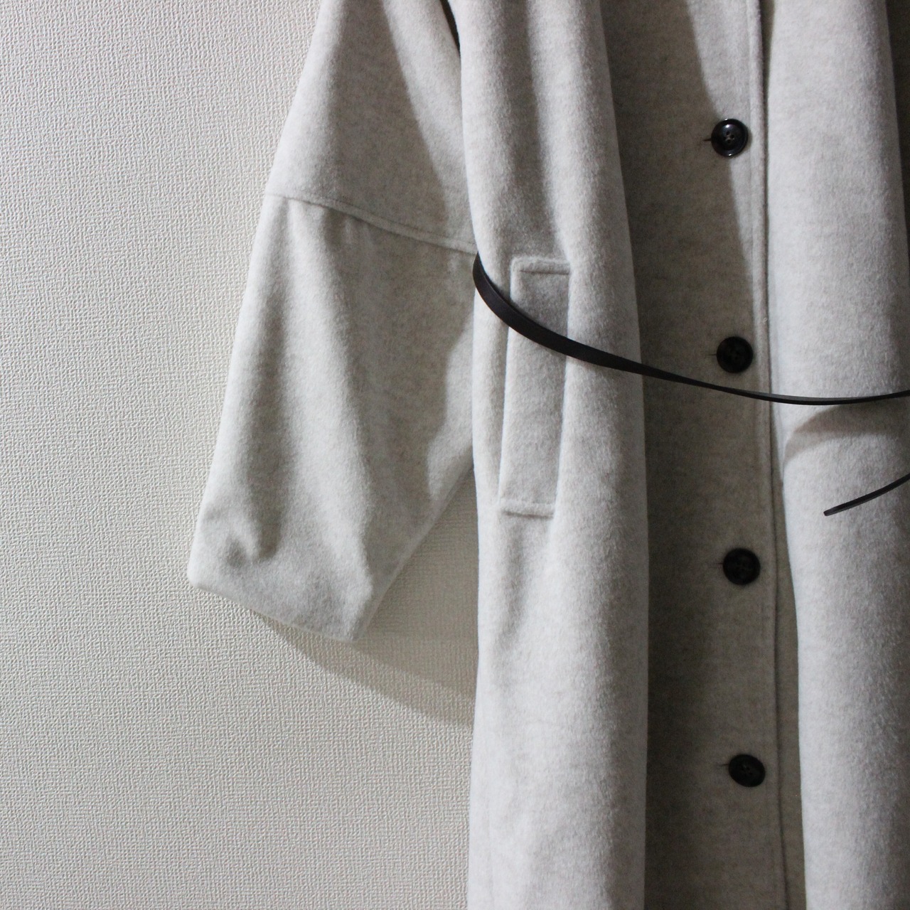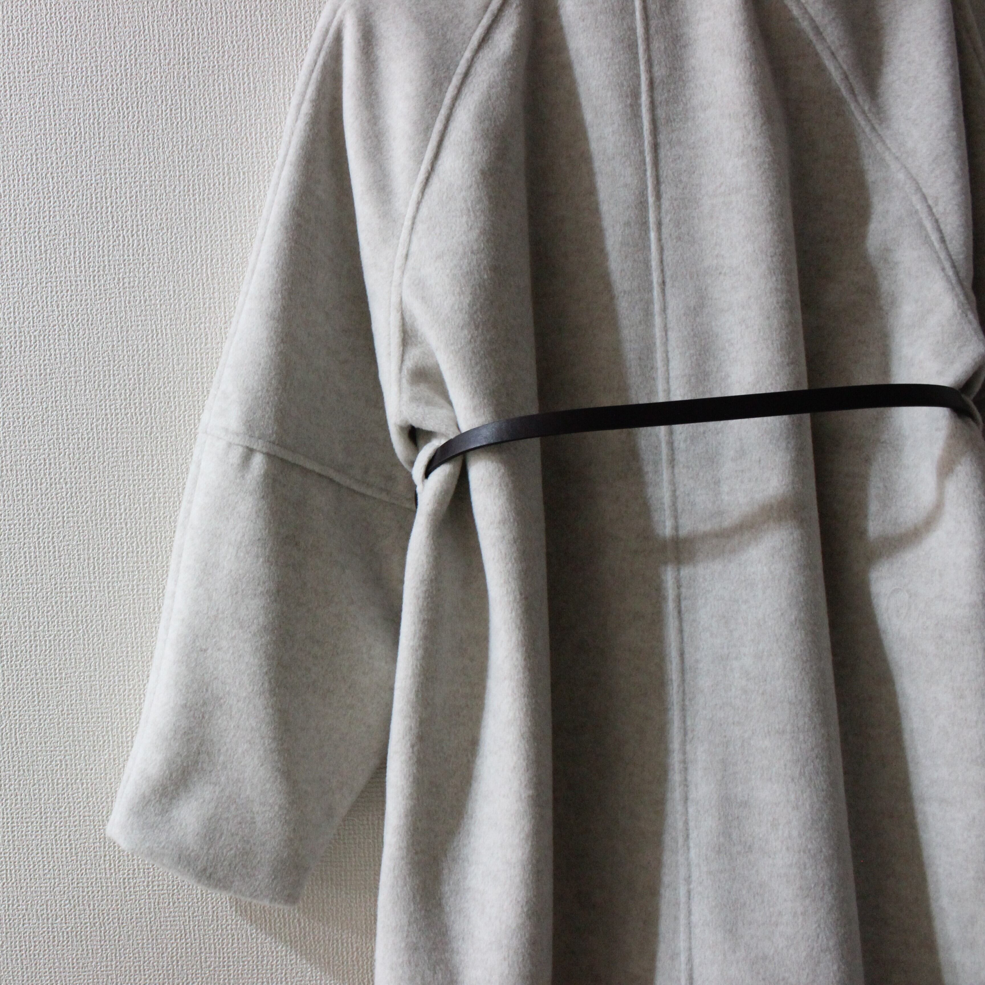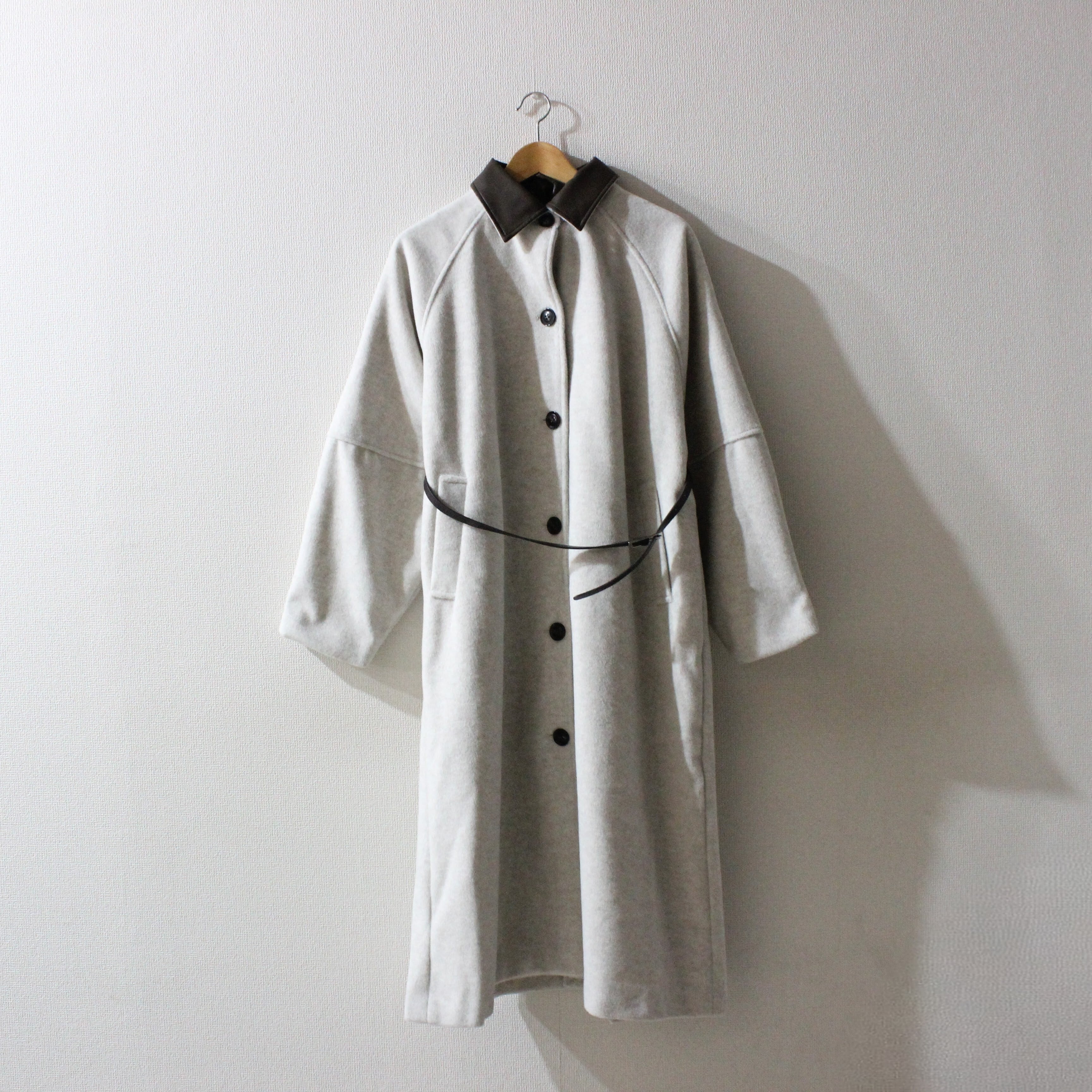 シルエットが美しいベルト付きステンカラーのロングコートです。