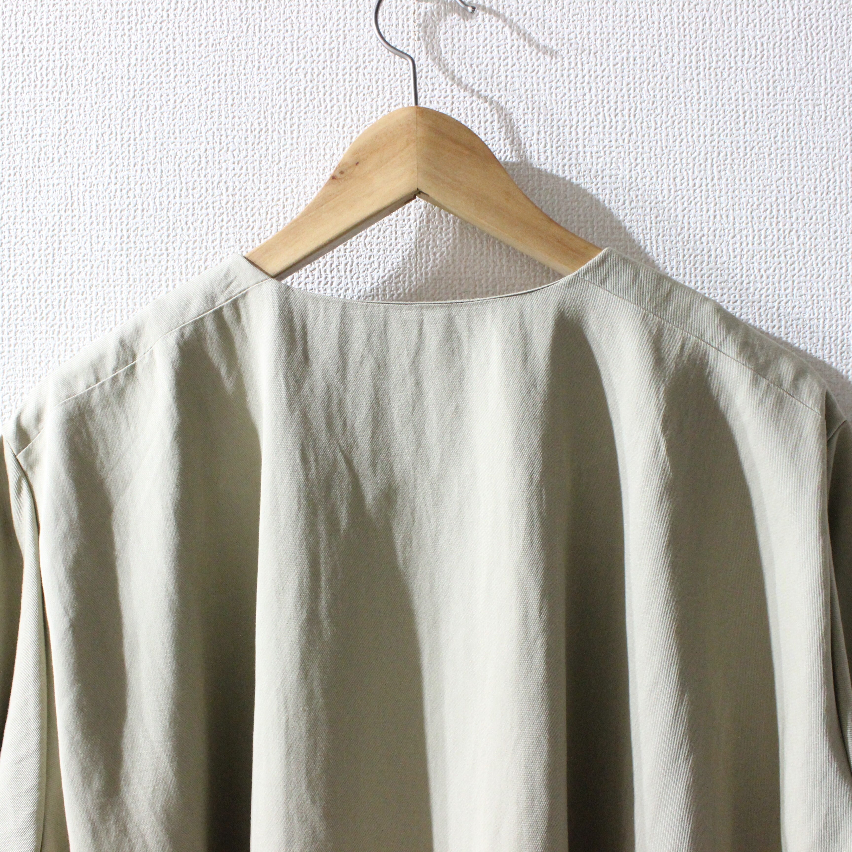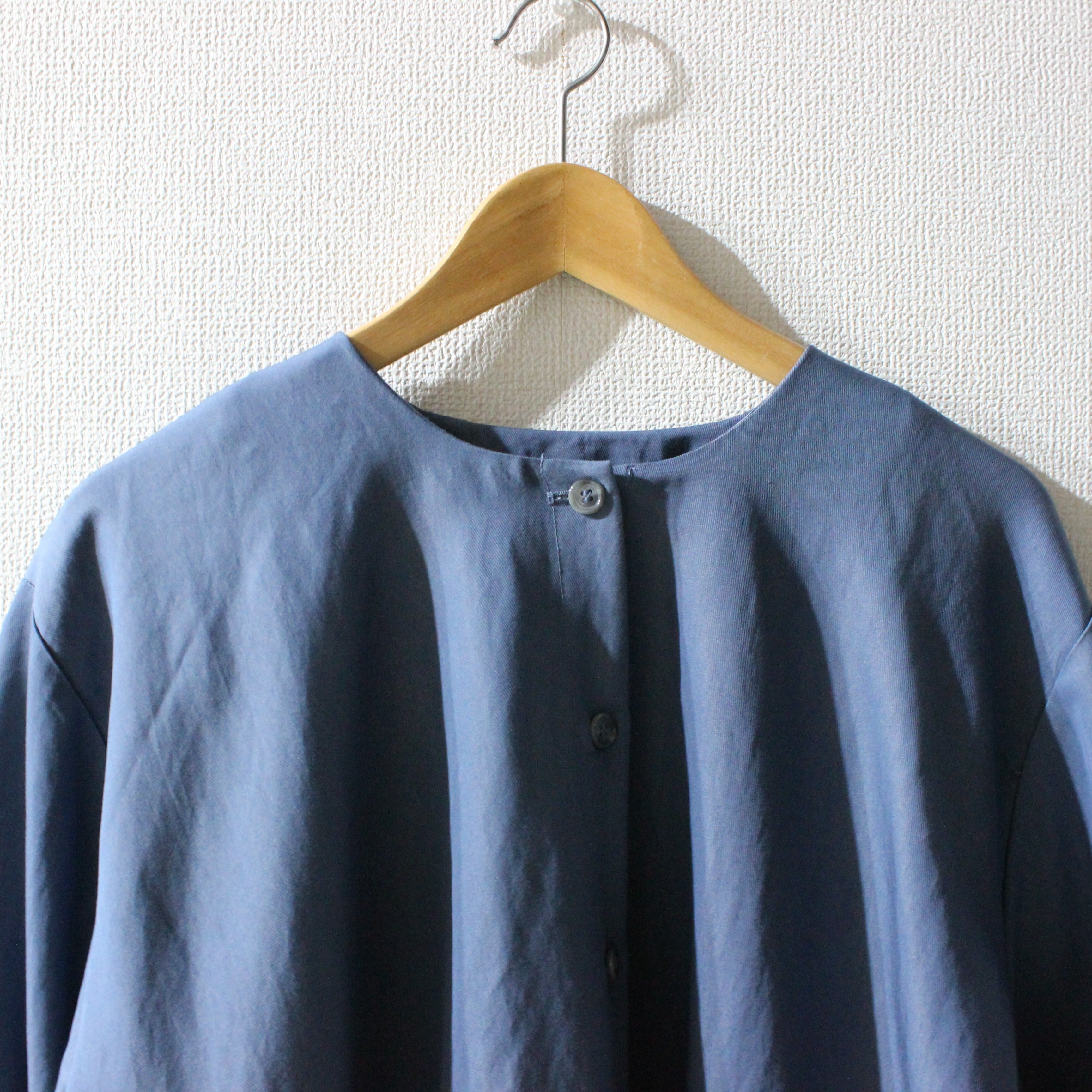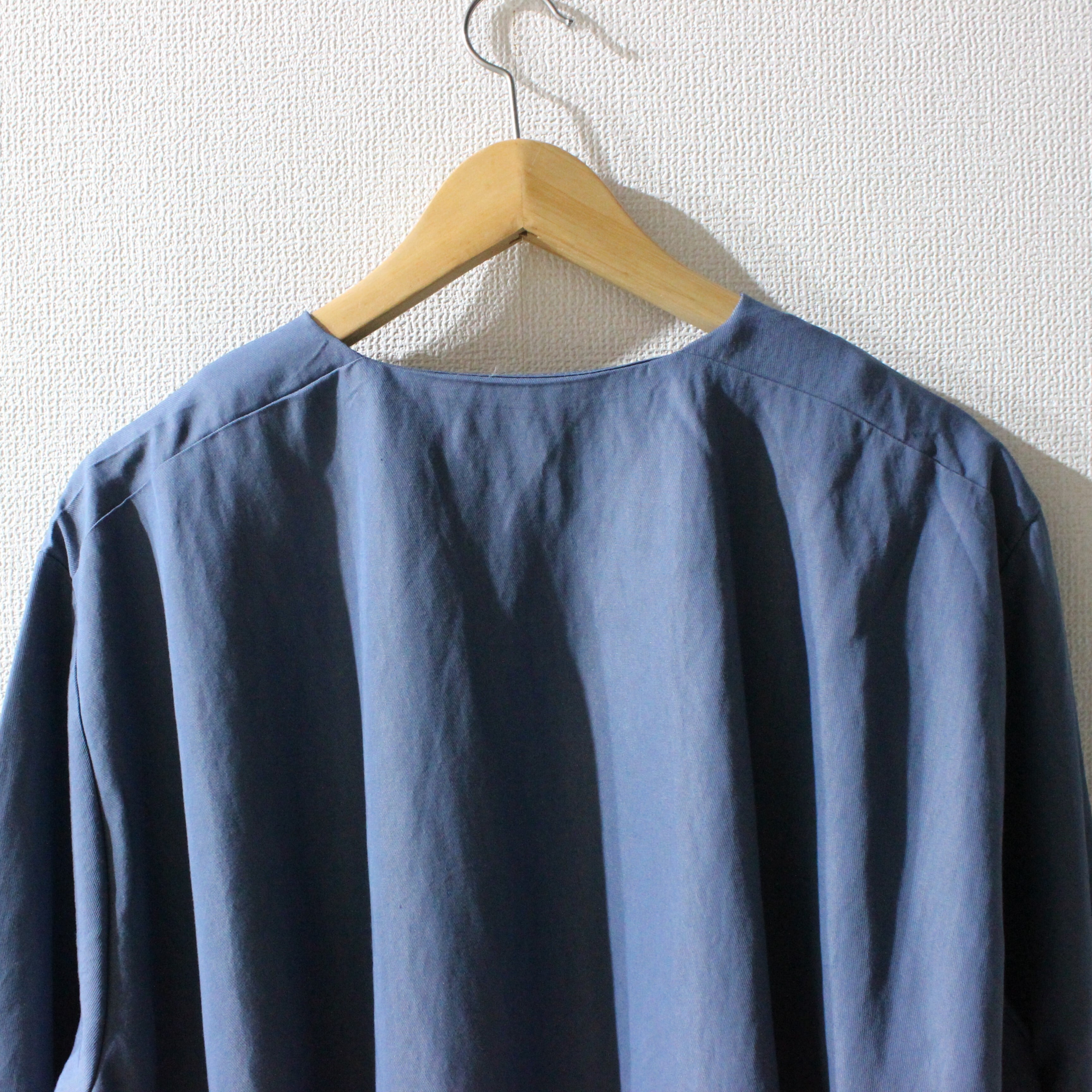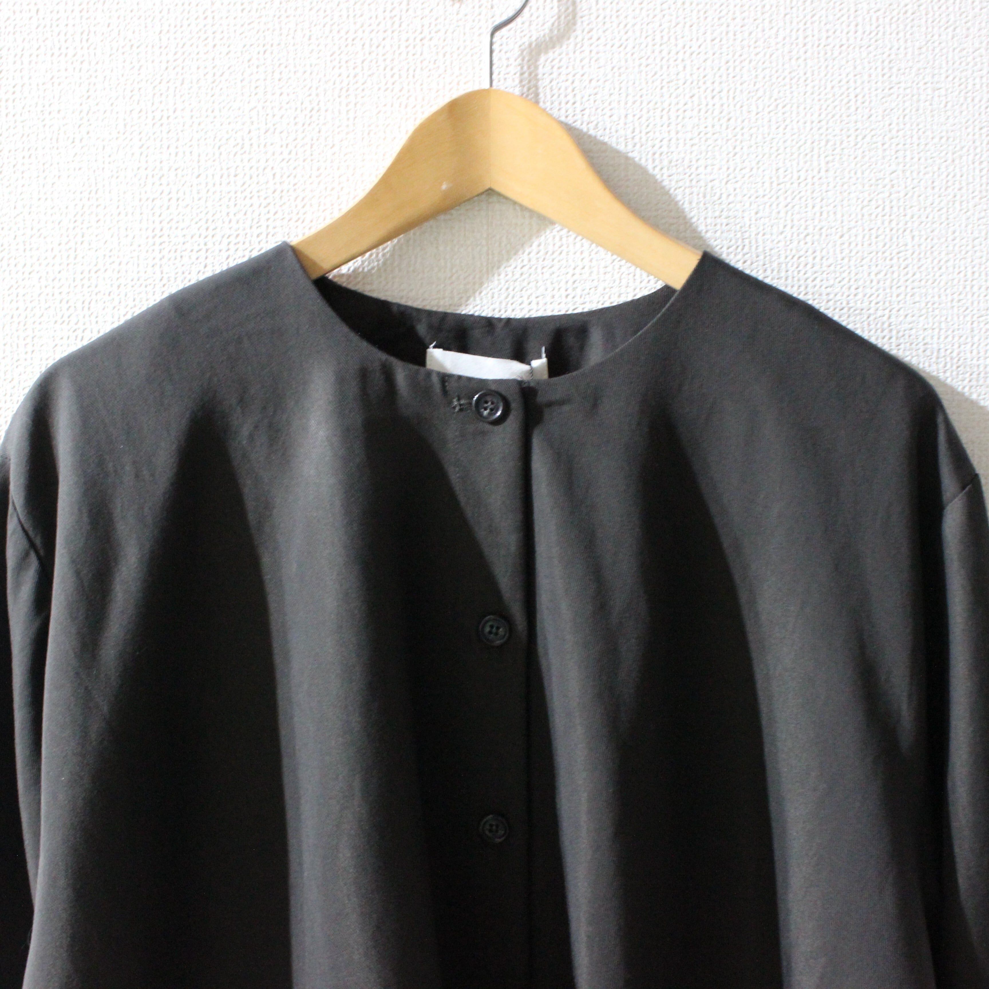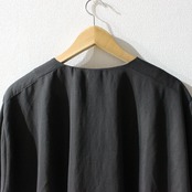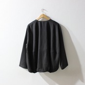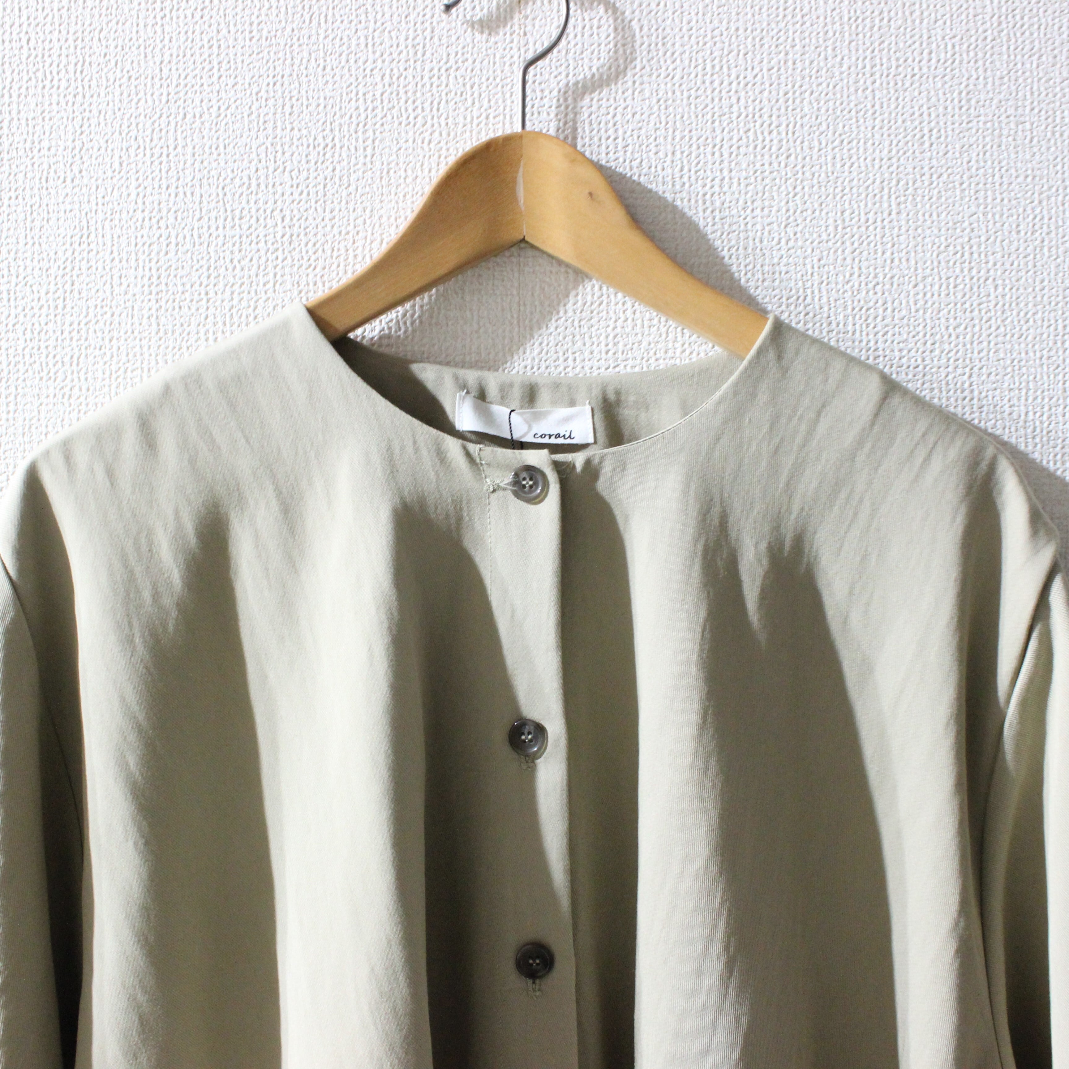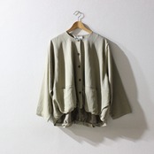 ノーカラーにスラッシュポケットでシンプルにまとめつつ