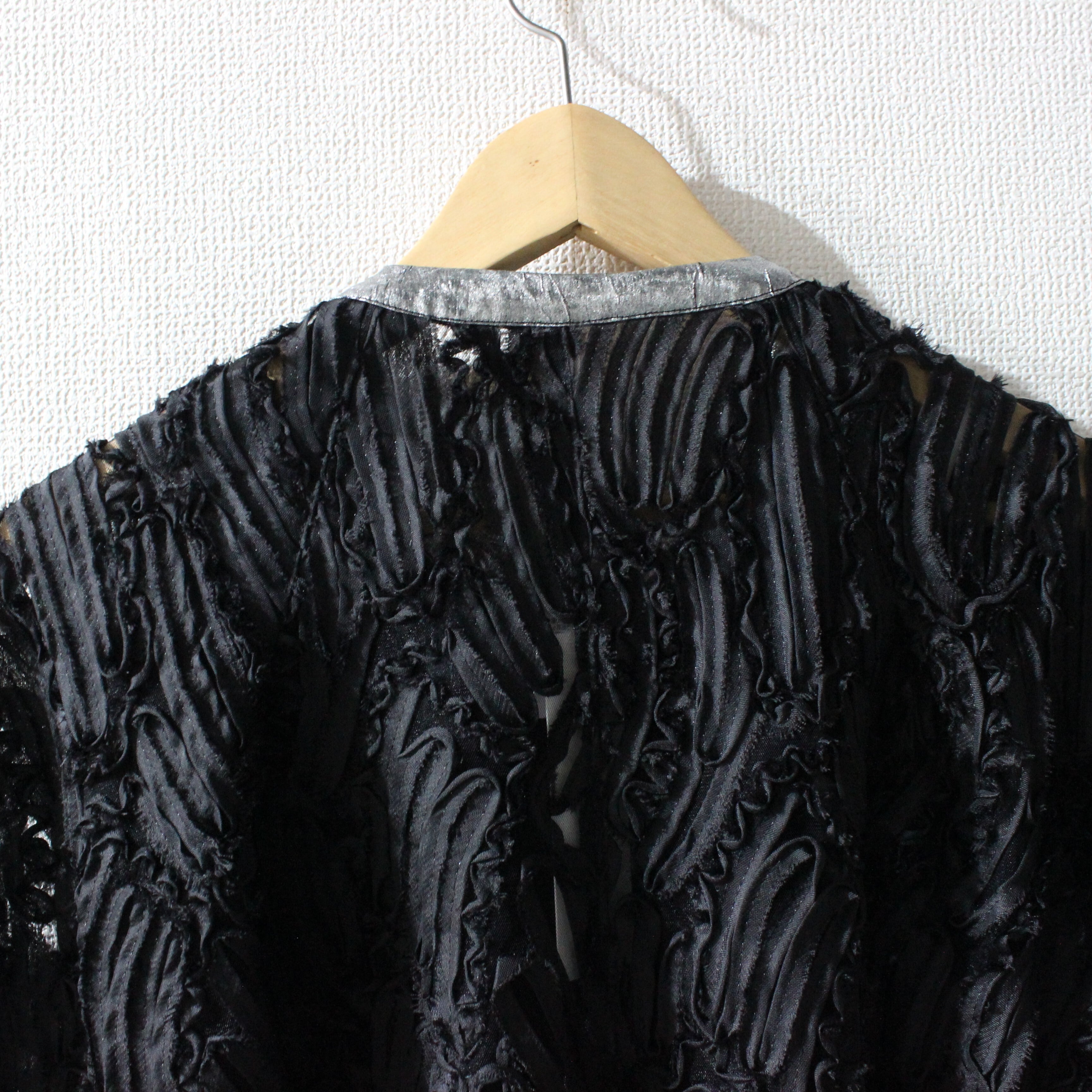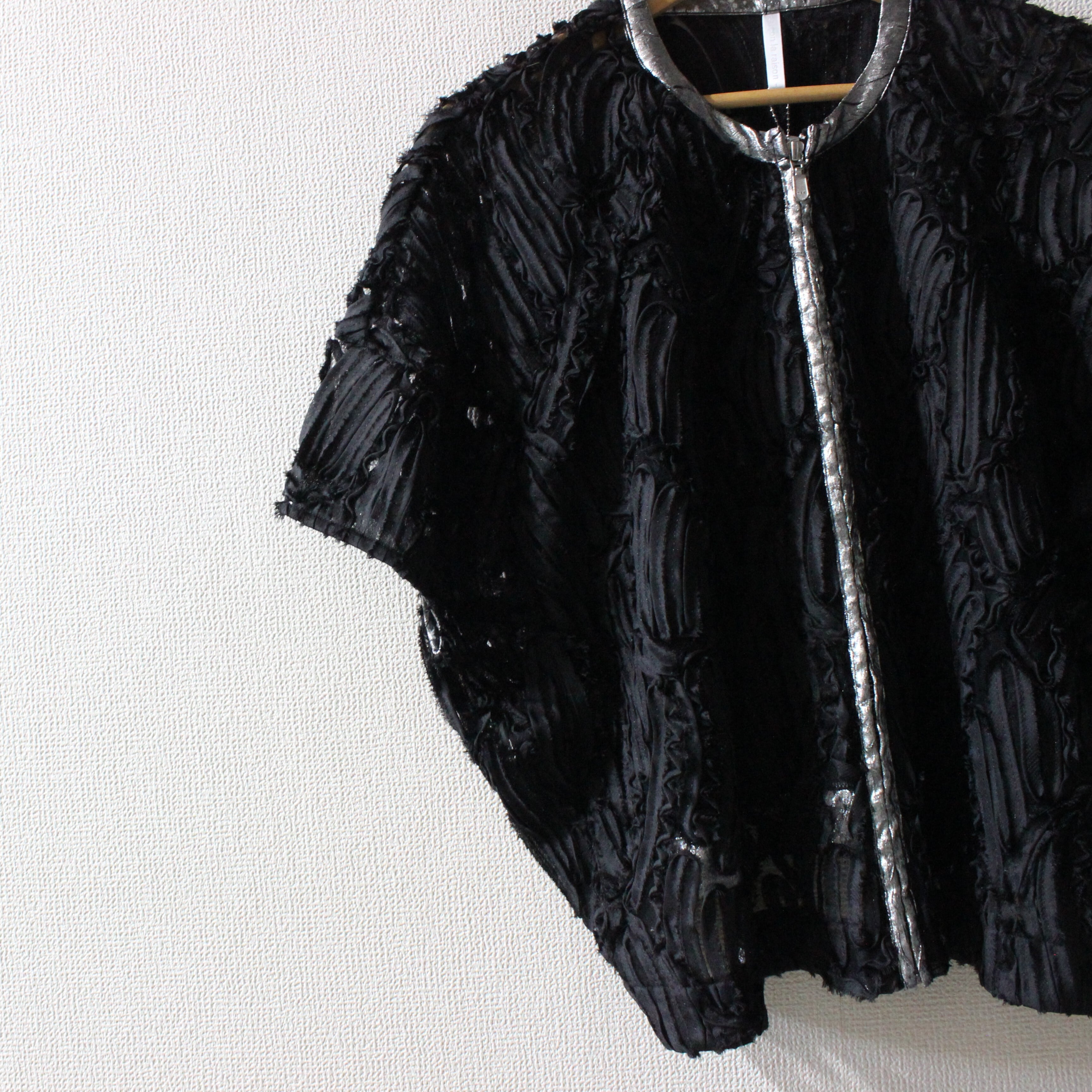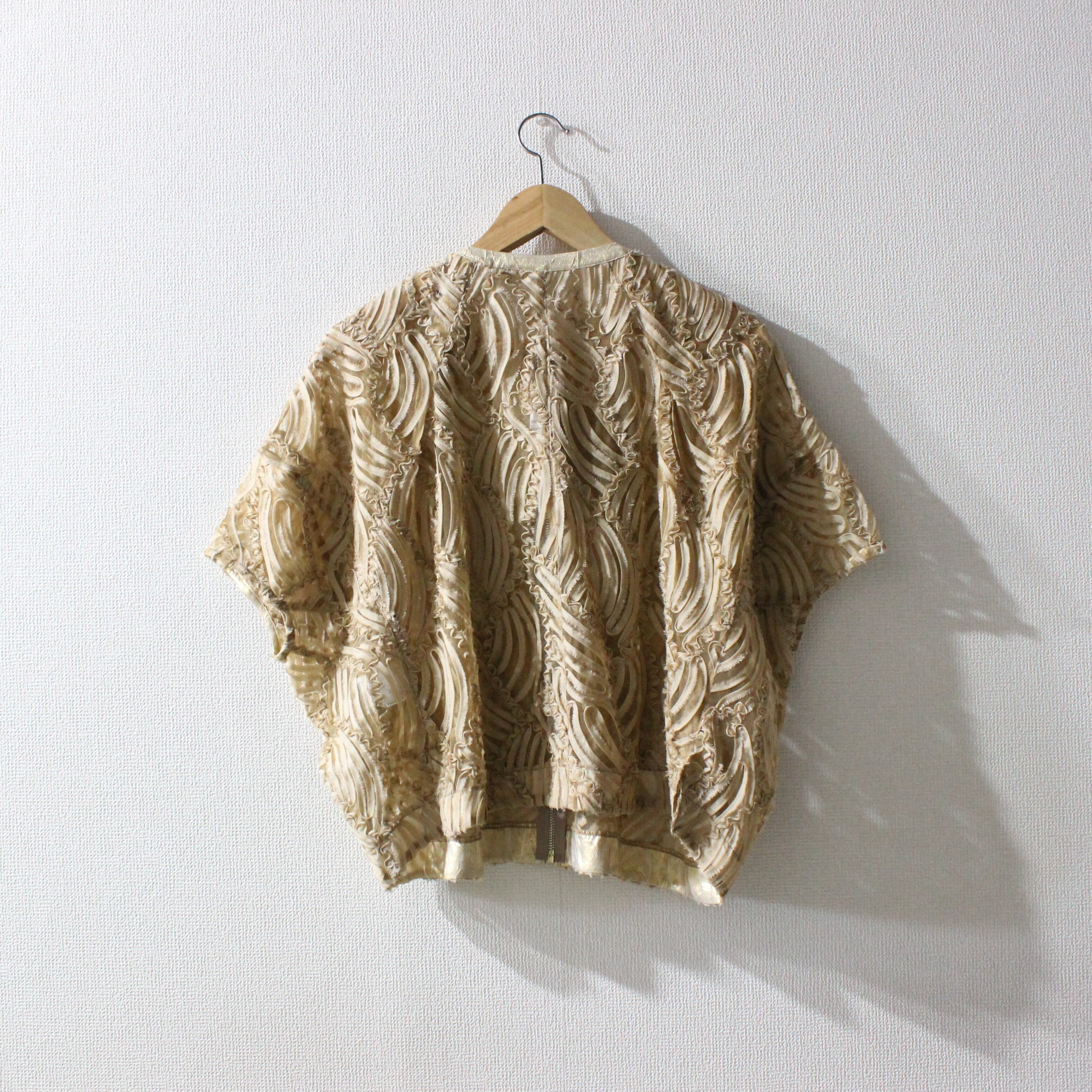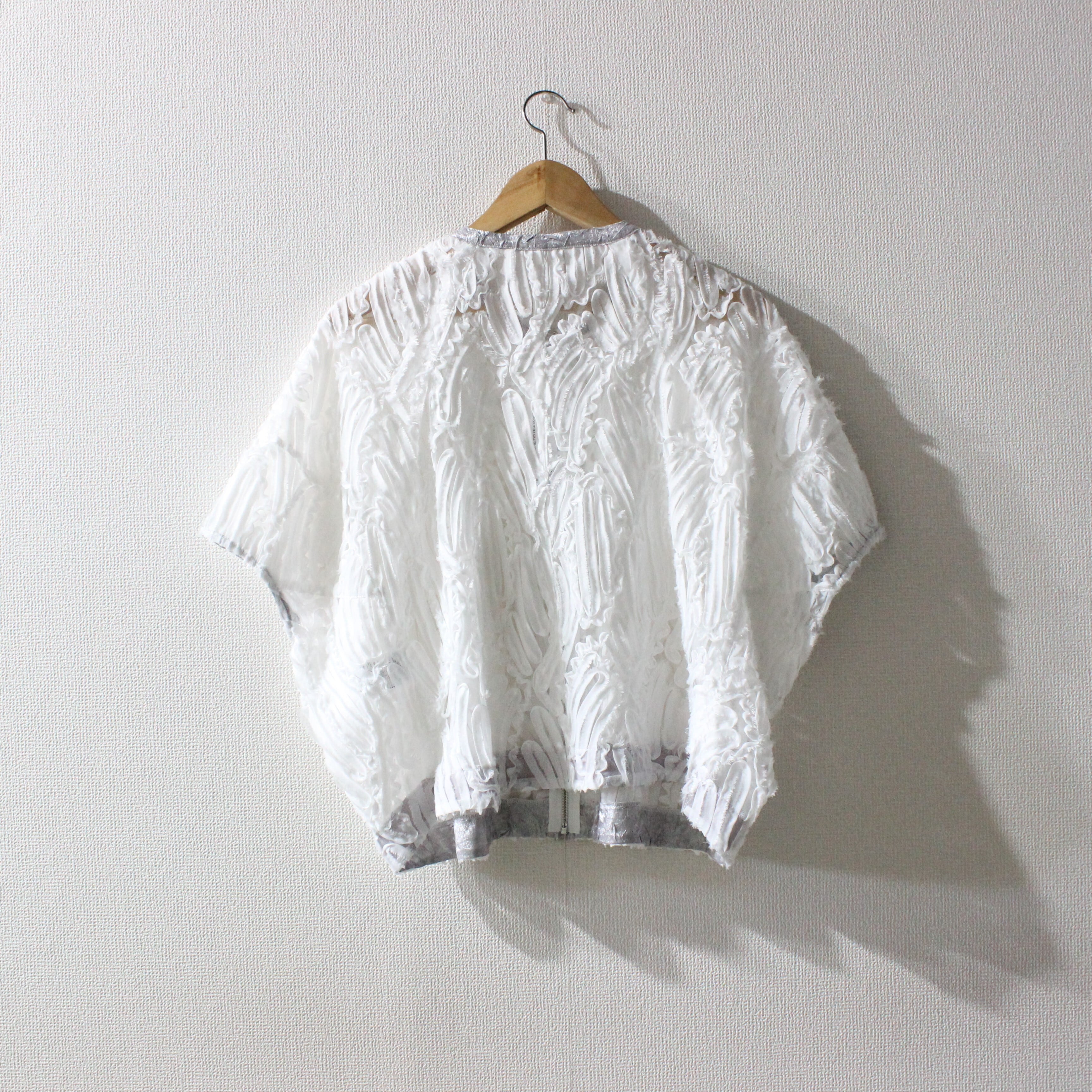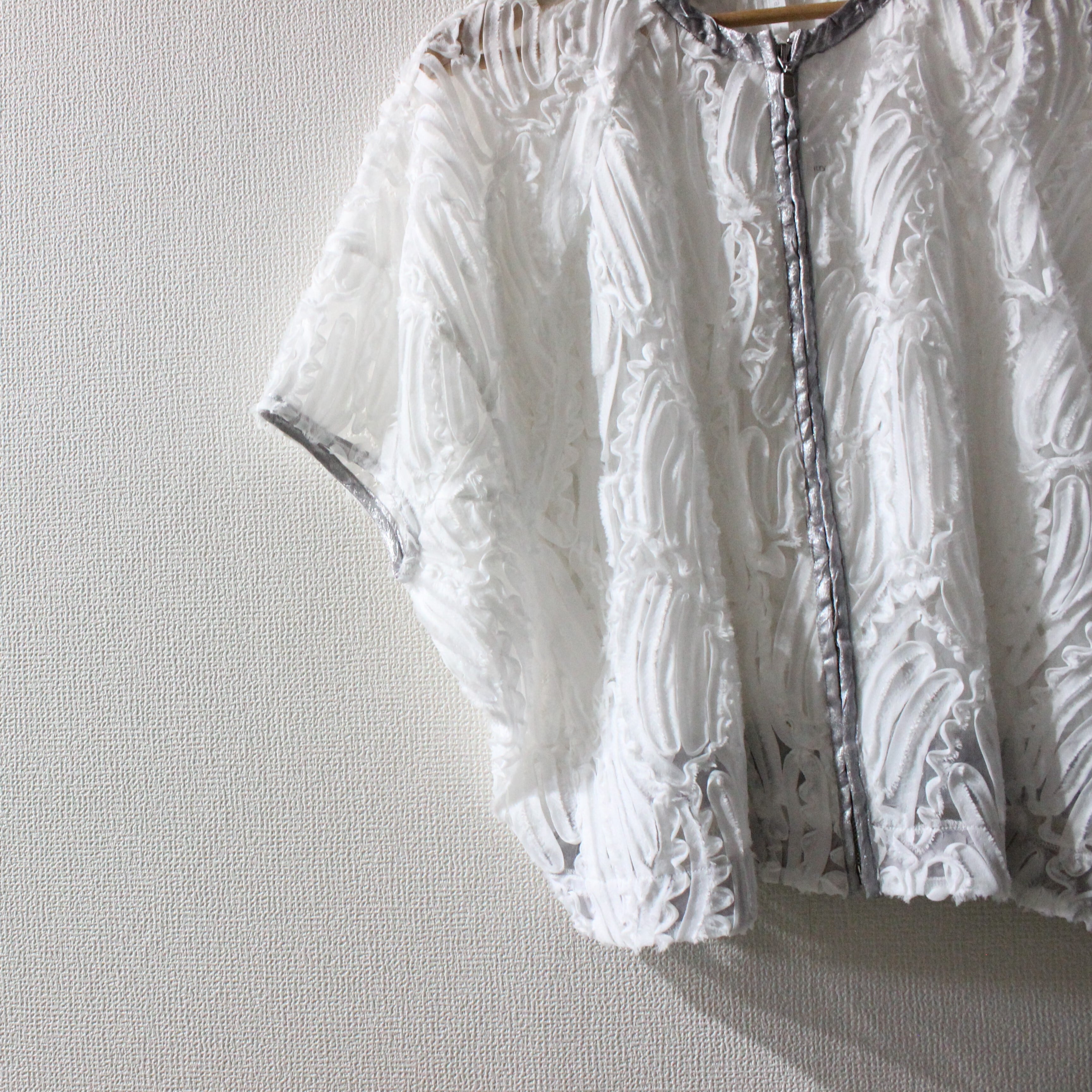 チュールにラインコードを施した軽やかな本体に、箔プリント生地をアクセントにした「ランタンスリーブジャケット」。透け感のあるチュール素材に細かなラインコード刺繍を施し、立体的な花柄風の表情豊かな質感が印象的です。肩から肘にかけてふんわり広がるボリュームたっぷりのランタンスリーブがポイント!洗練されたディテールで男女問わず上質に着こなせます。カラー展開は春夏のブライダルやパーティーにもぴったりなクリーンで華やかなオフホワイト、シックで汎用性高く、夜のイベントやフォーマルコーデにもオススメのブラック、上品なベージュトーンで肌馴染み良く、デイリーきれいめスタイルに使えるモカの3色です。