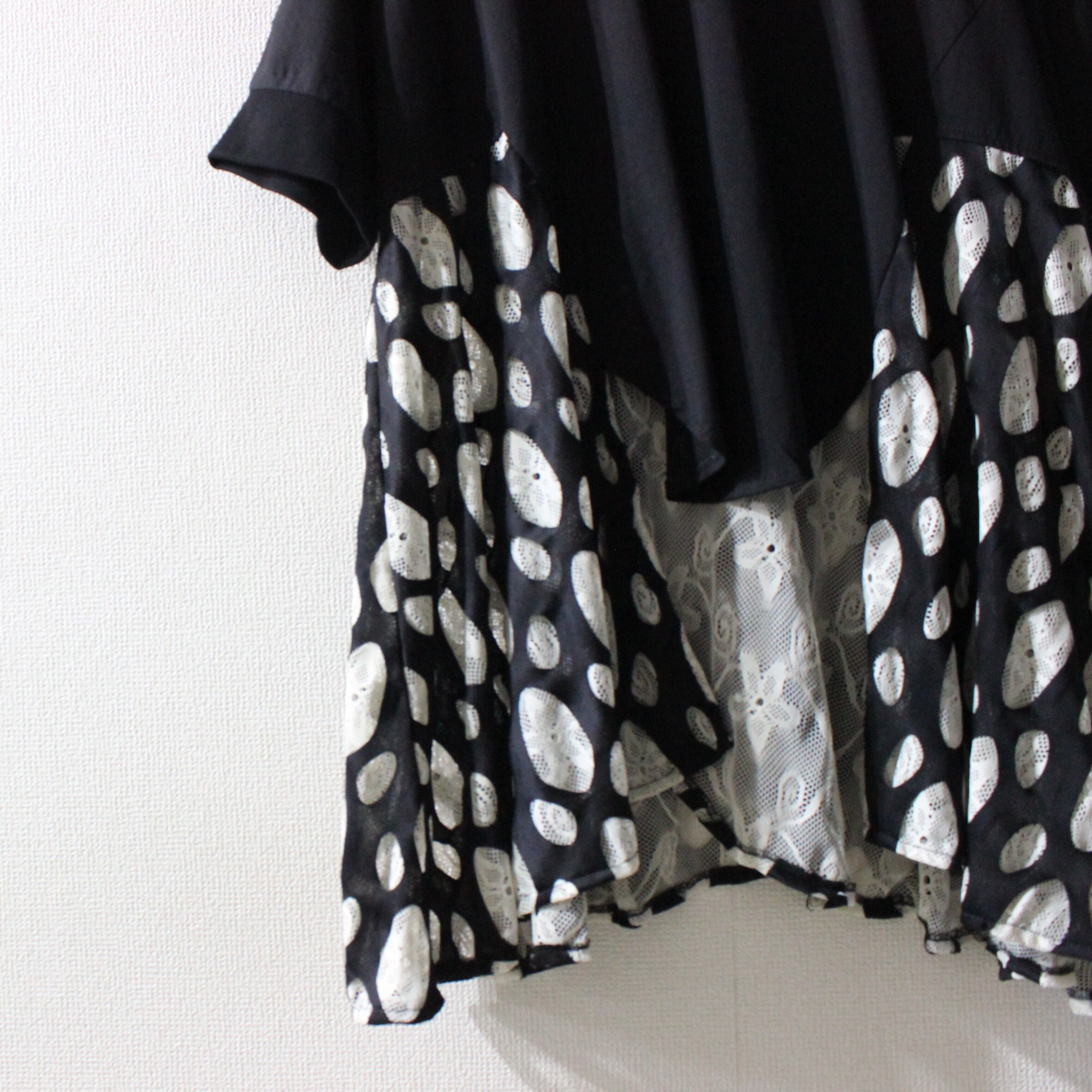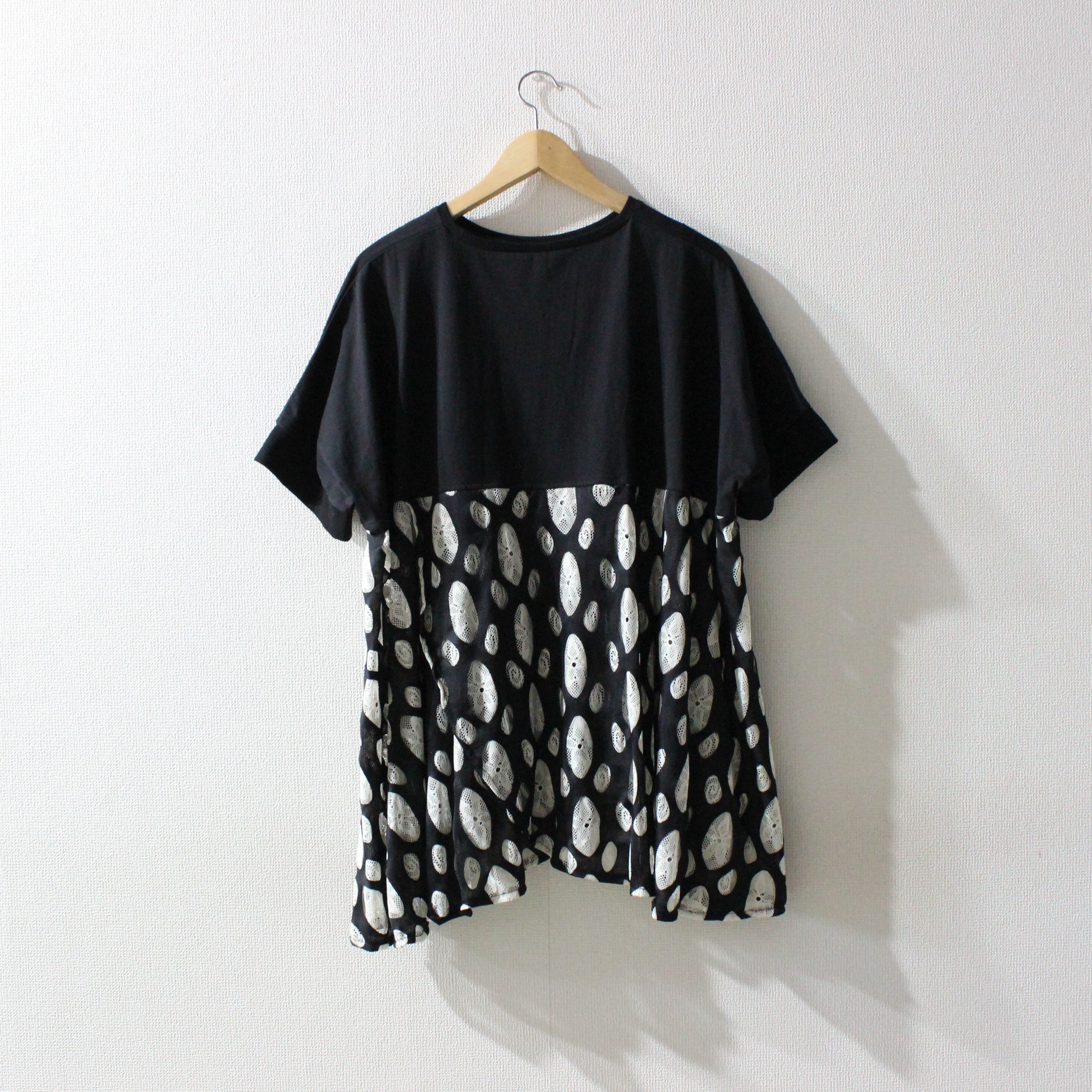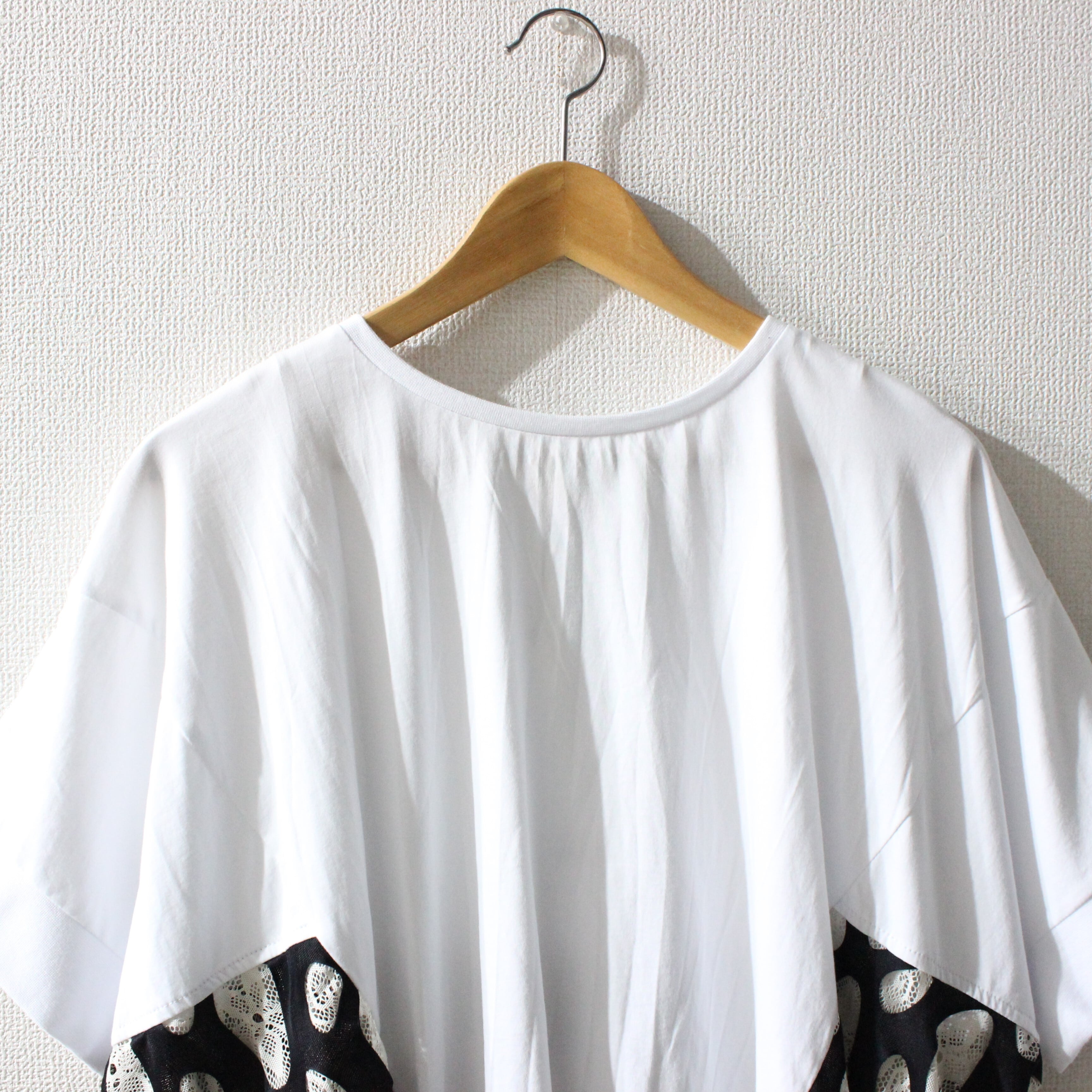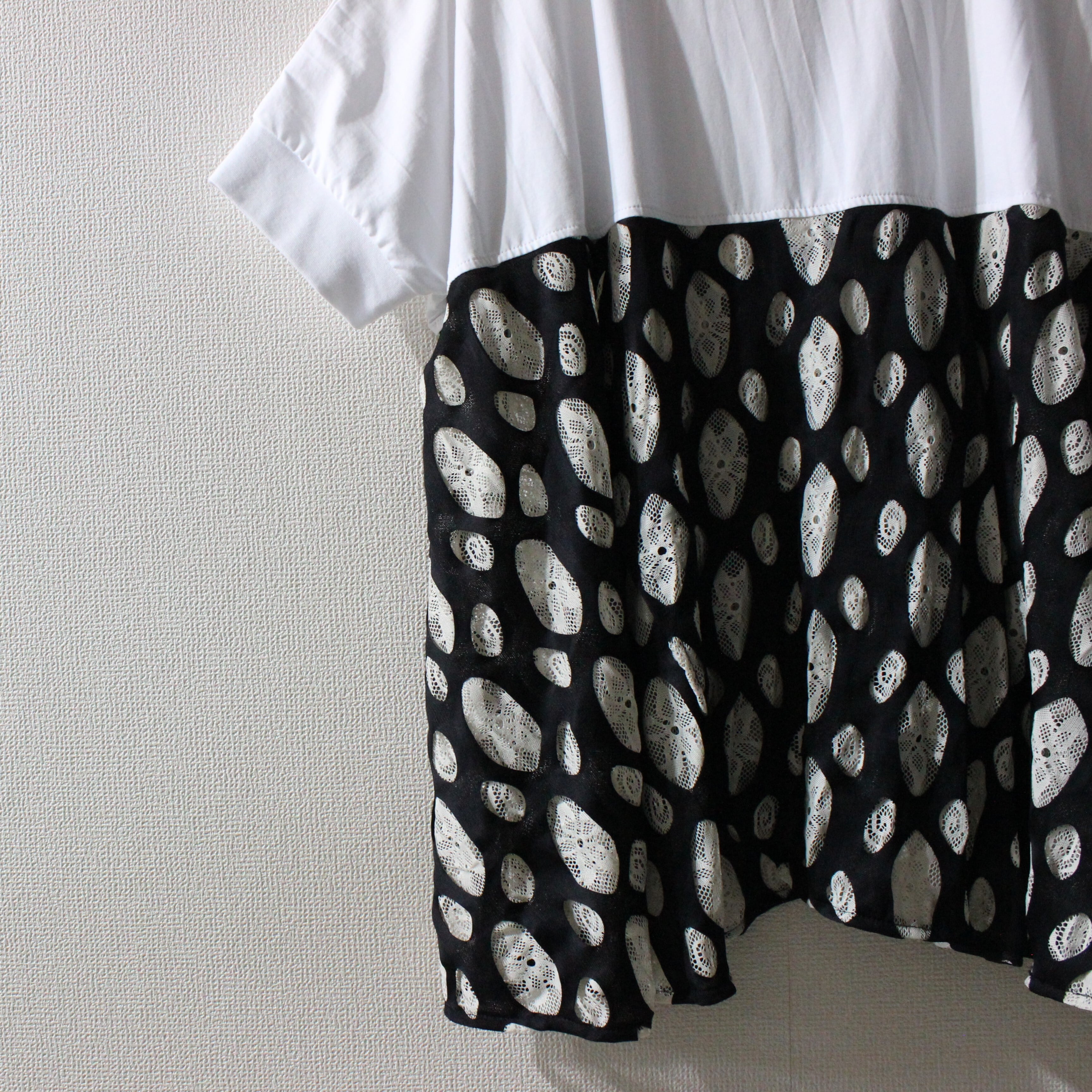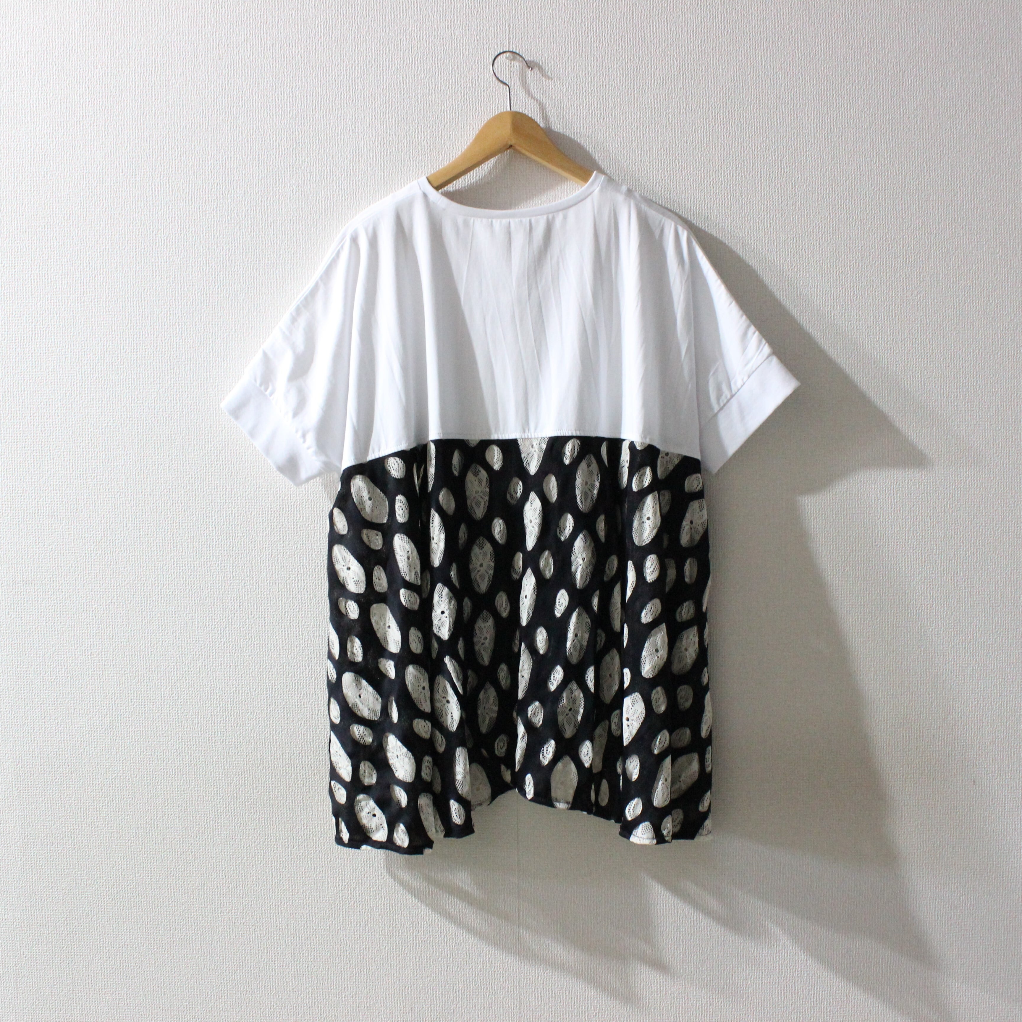 本体は柔らかい天竺素材で、脇下から裾にかけて2重レースの切り替えで華やかさをプラスしました。ドットや渦巻き柄の2重レースが特徴で、動きに合わせてフレアに広がる軽快なシルエットが魅力的。ゆったりとした身幅とドロップショルダーで、リラックス感のあるユニセックスデザインに仕上げました。スタイリングはデニムワイドパンツでカジュアルに、またはシアーパンツと合わせて統一感のあるセットアップもオススメです。
