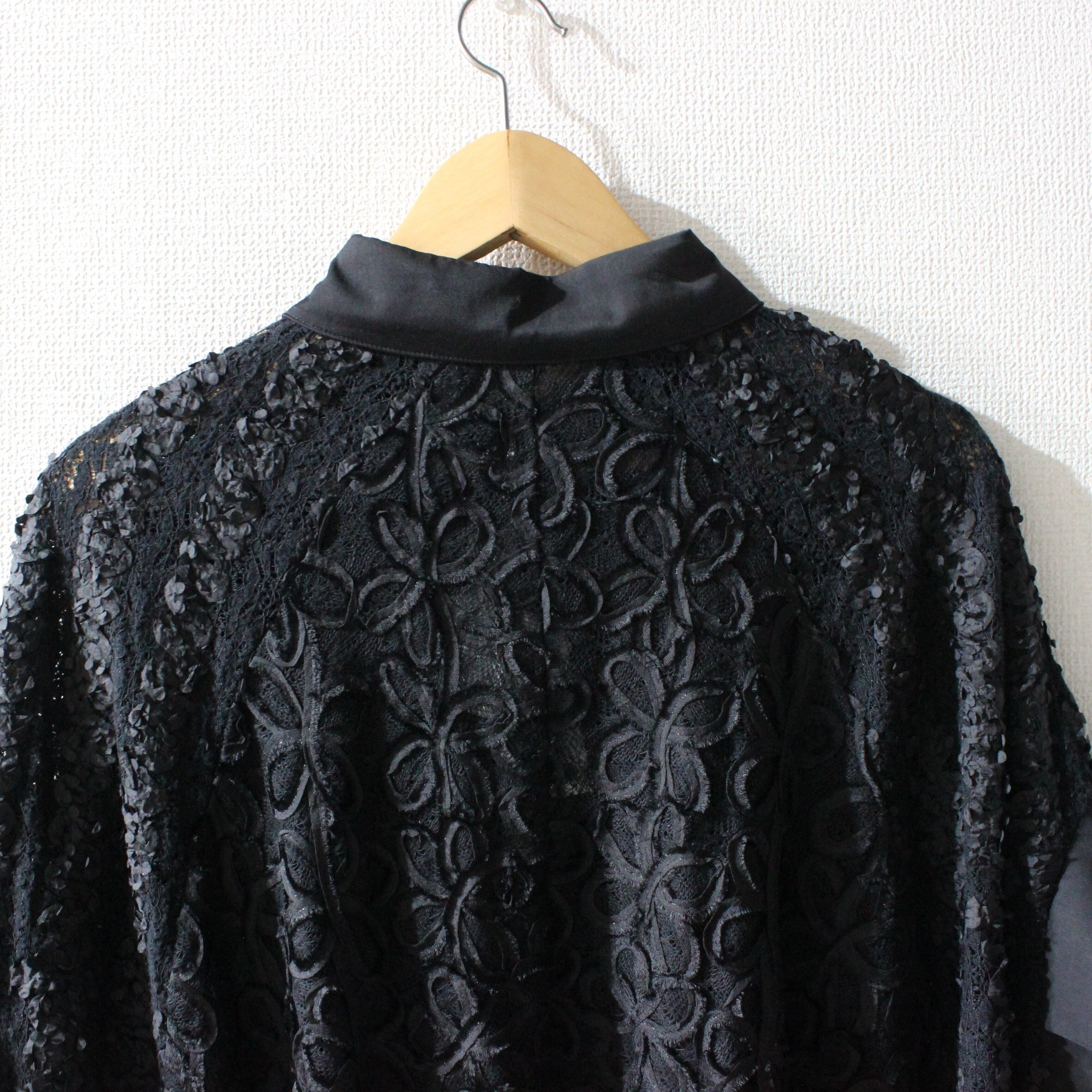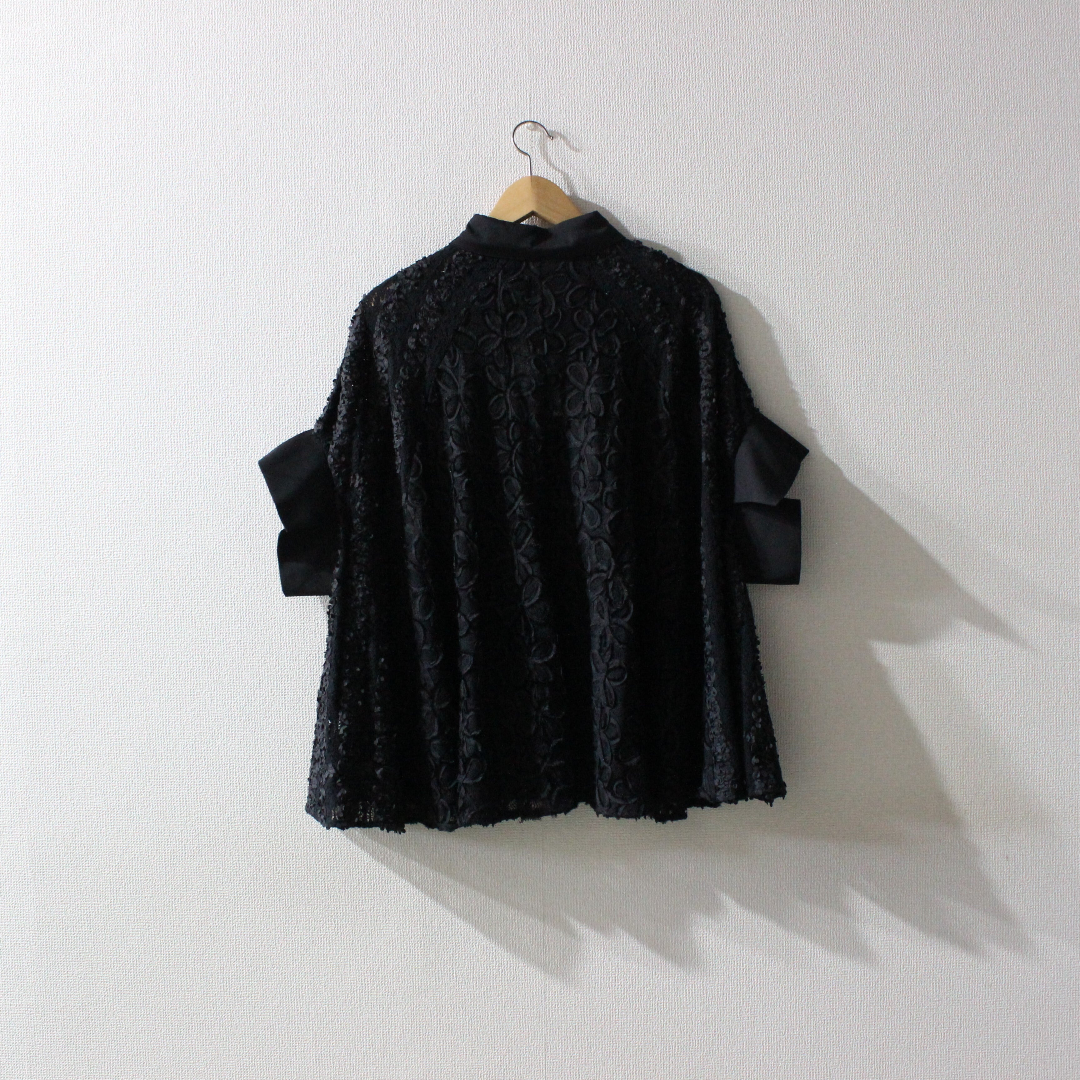 やわらかなコードレースを本体生地に贅沢に使った、ゆったりシルエットのワイドブラウスです。全面に立体感のあるコードレースをあしらい、華やかさと上品さを両立した一枚。身頃はたっぷりとワイドに広がるケープのようなフォルムで、身体のラインをひろいにくくリラックスして着られます。ハリのある生地の襟と前立て、袖口の切り替えがアクセントになり、甘くなりすぎない大人の雰囲気に。ハレの日やオケージョンからデイリーのきれいめスタイルまで、ボトムや合わせる小物次第であらゆる場面で活躍する主役級のブラウスです。