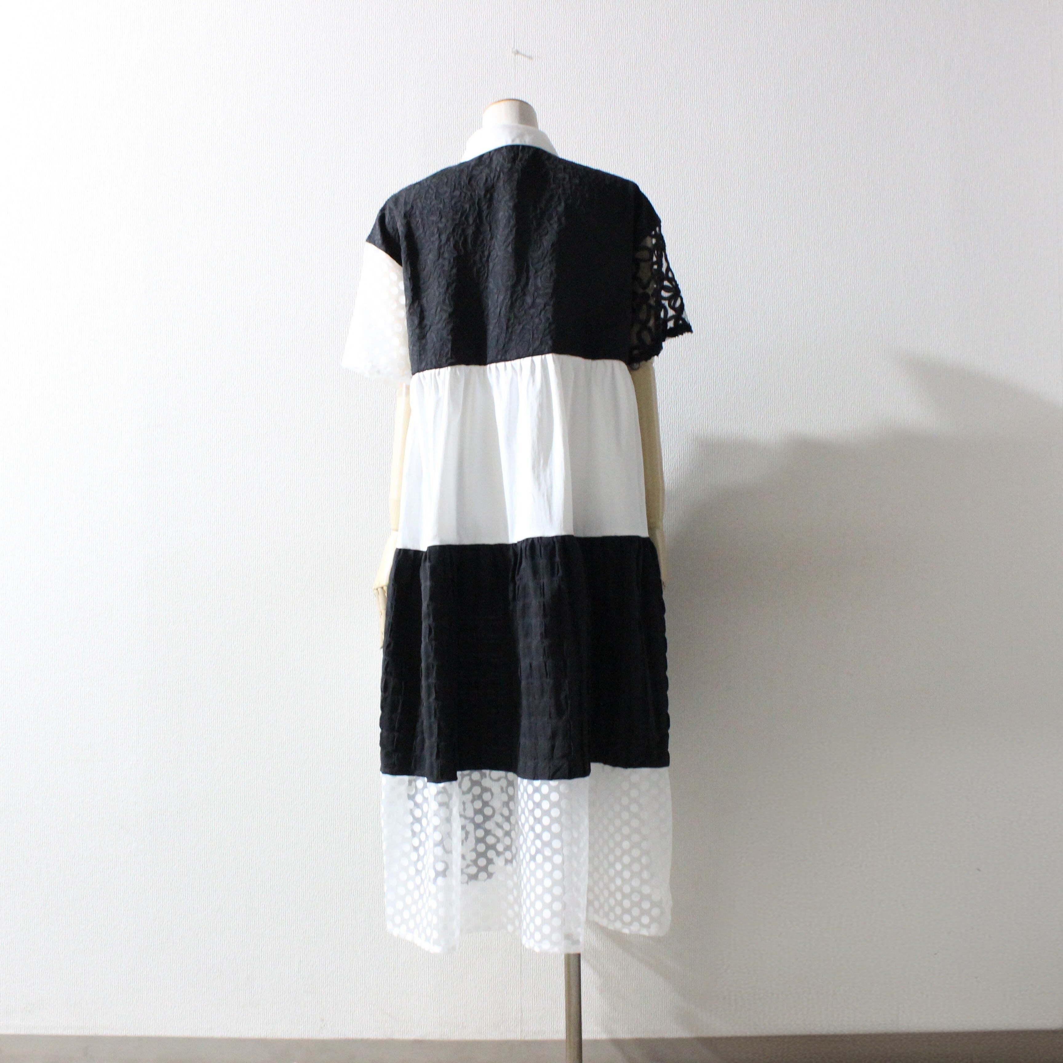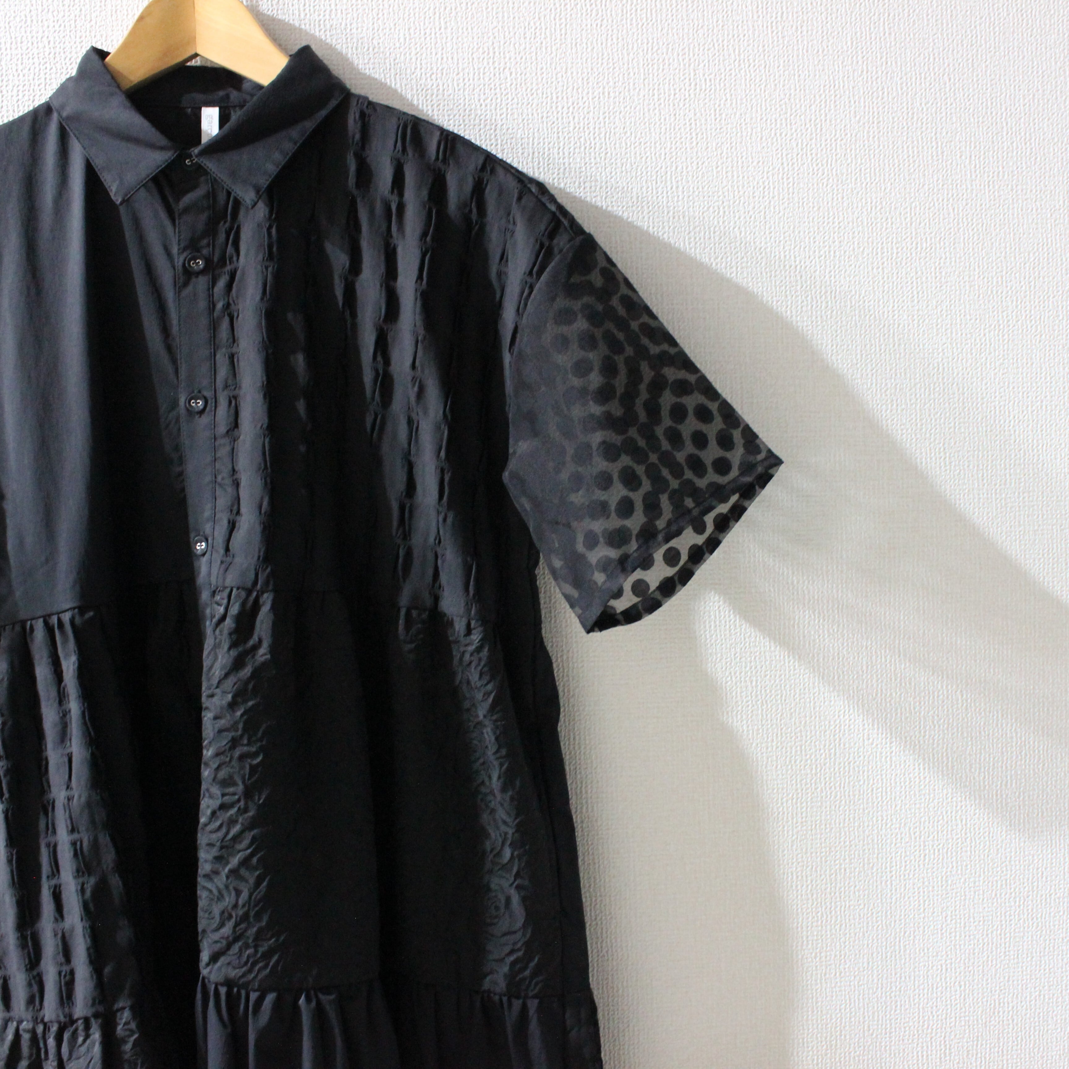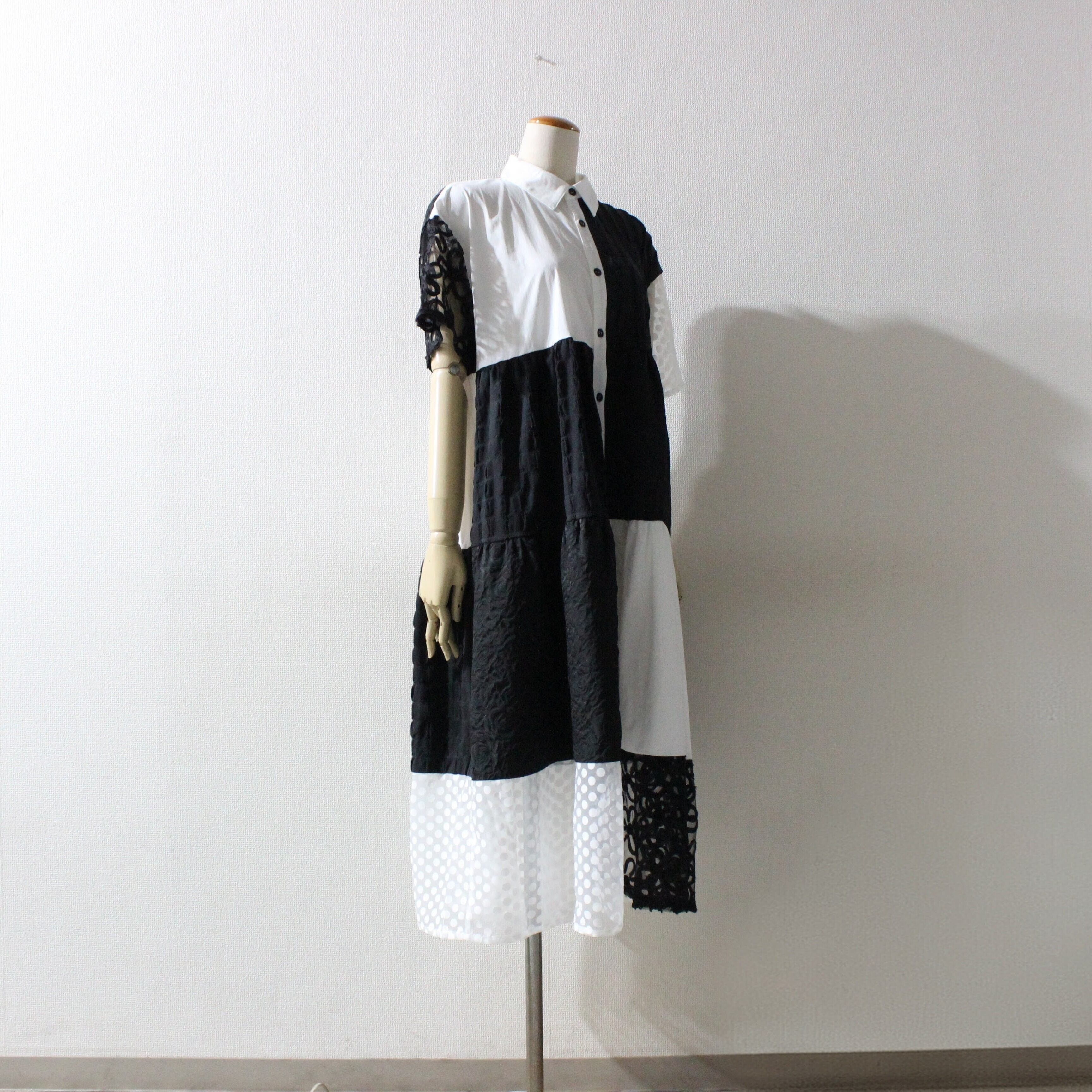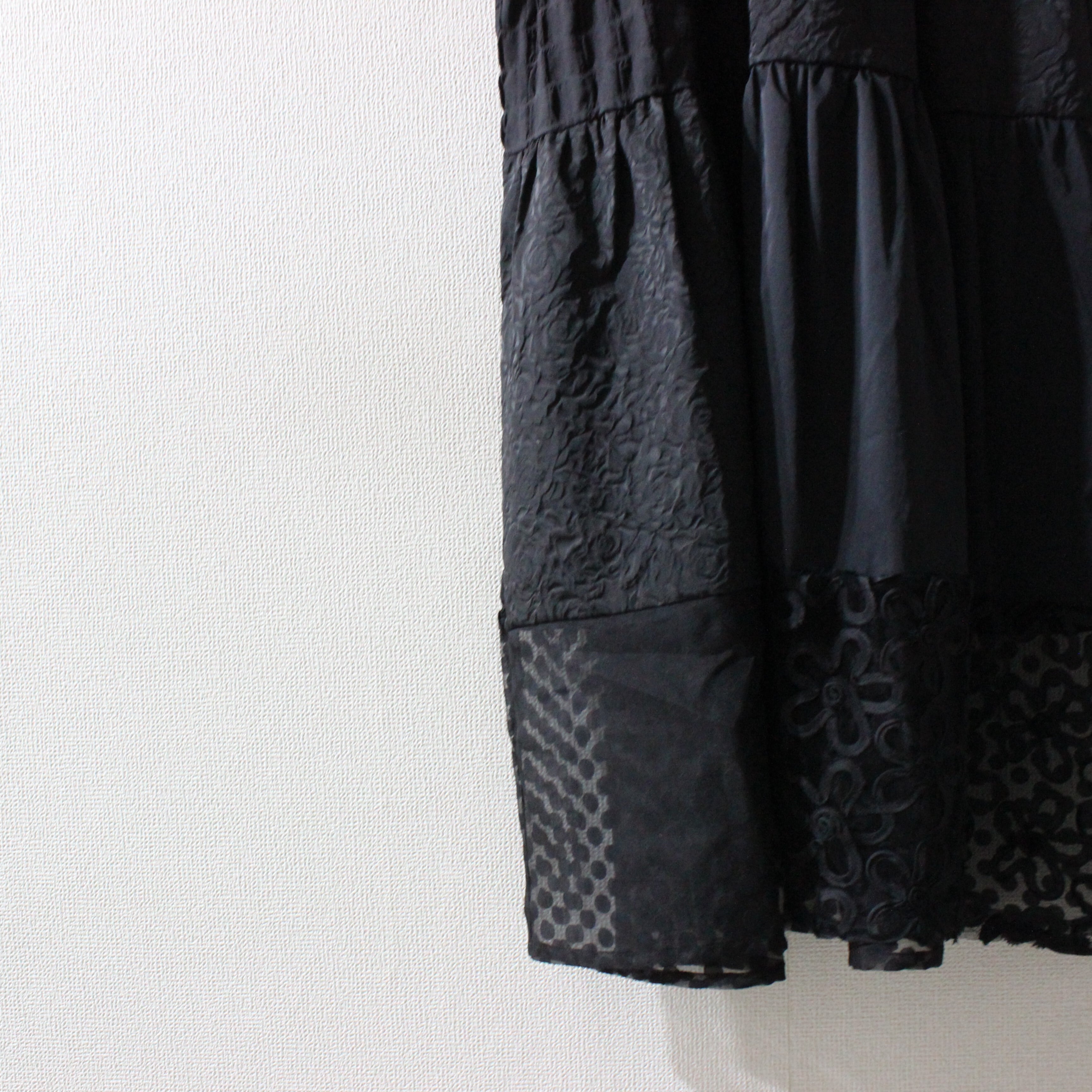 ドットやフラワーコードを施したチュール素材や花柄のジャガード生地など様々な素材を使用し、前ボタン開きのシャツデザインのシルエットが上品なティアードワンピース。袖と裾の透け感のあるチュール素材が立体的なティアードフレアを軽やかに演出します。フォーマルからデイリーまで対応し、合わせる小物アイテム次第でオケージョンシーンにも活躍します。