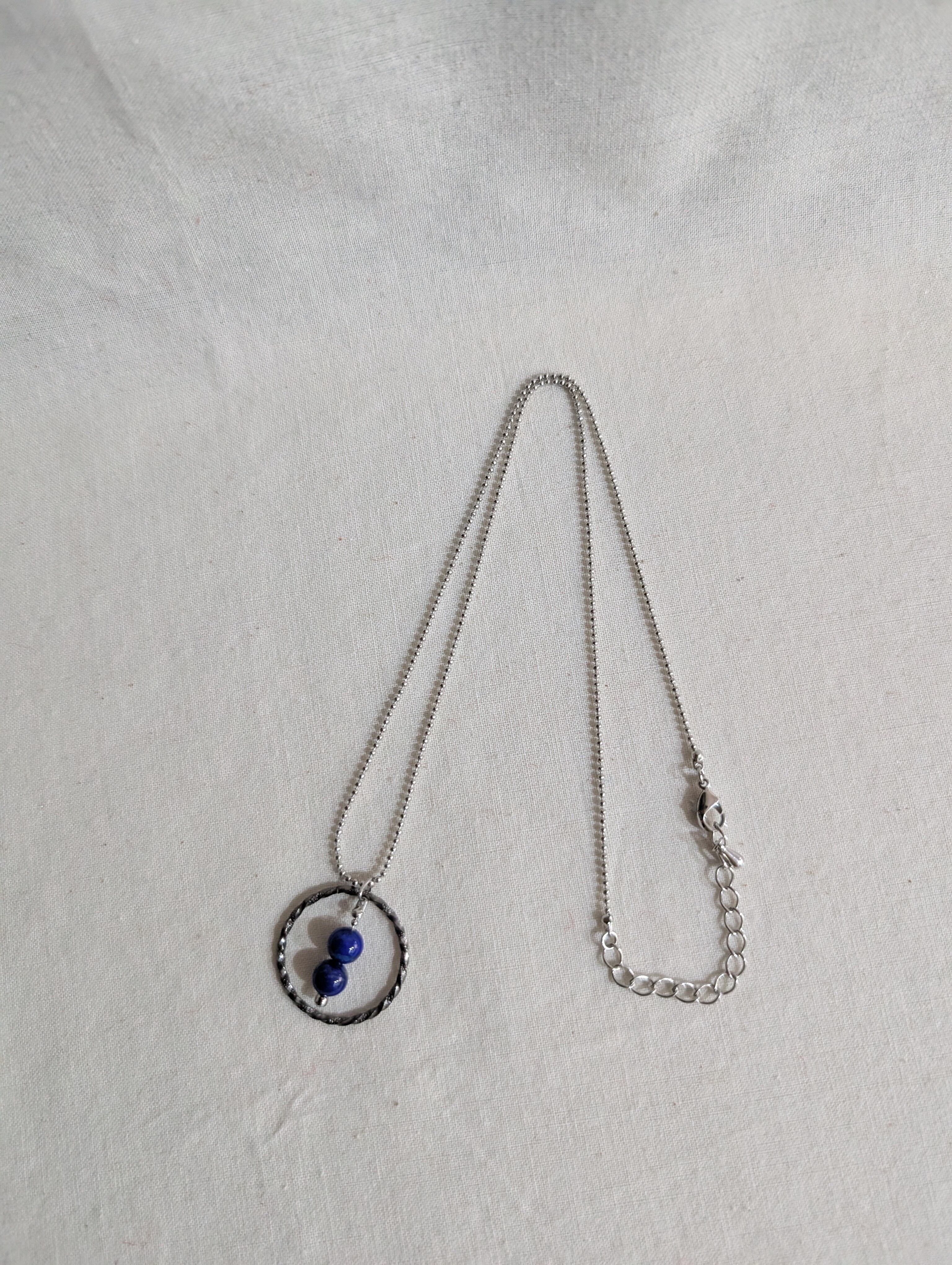 2粒のラピスラズリにツイストサークルのコンビが印象的なネックレス。
